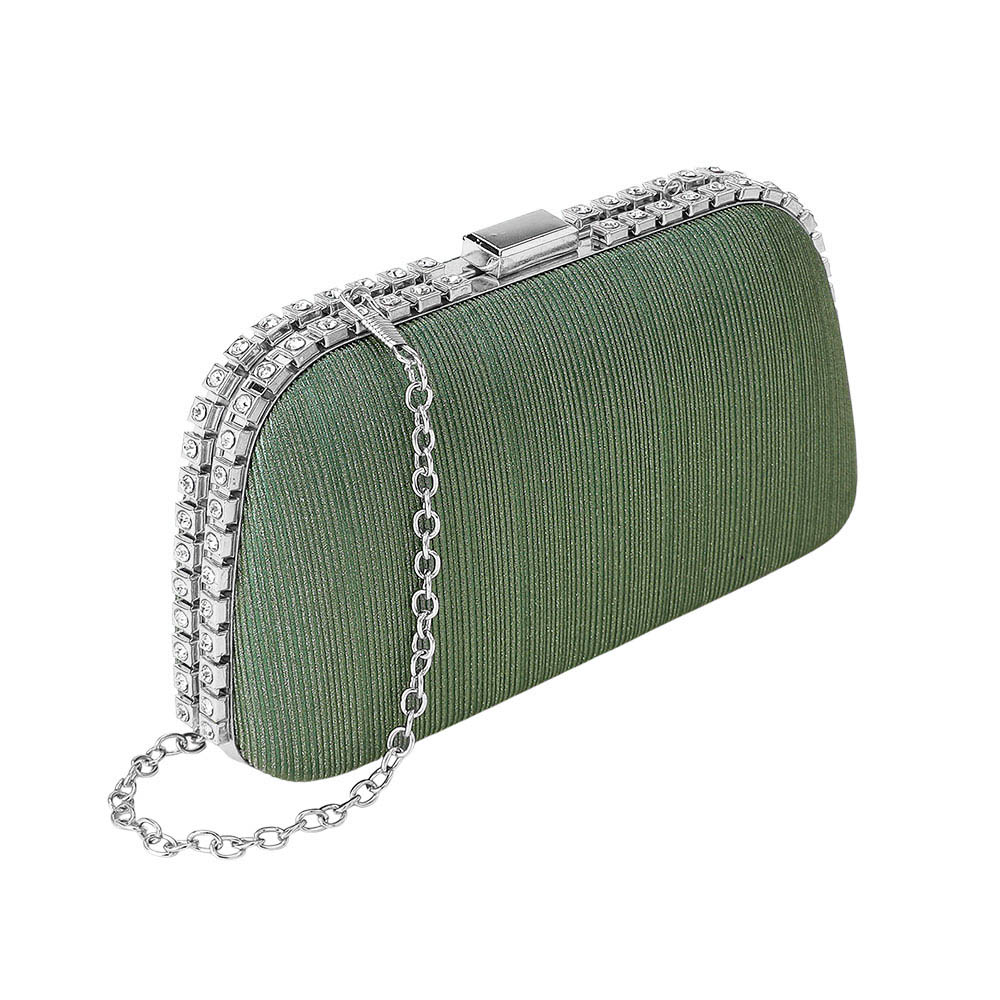 • Chic evening clutch featuring a textured finish, shimmering rhinestone trim, and a detachable chain strap. Designed with a sleek clasp closure and gold-tone accents, this sophisticated handbag is perfect for weddings, parties, and formal events, adding timeless glamour to any outfit.