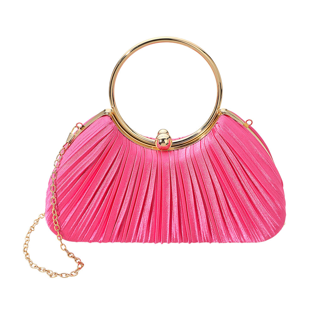 • Elegant pleated evening clutch designed with a round ring handle and detachable chain strap. Perfect for weddings, parties, or formal events, this chic accessory adds refined style and sophistication to any outfit.