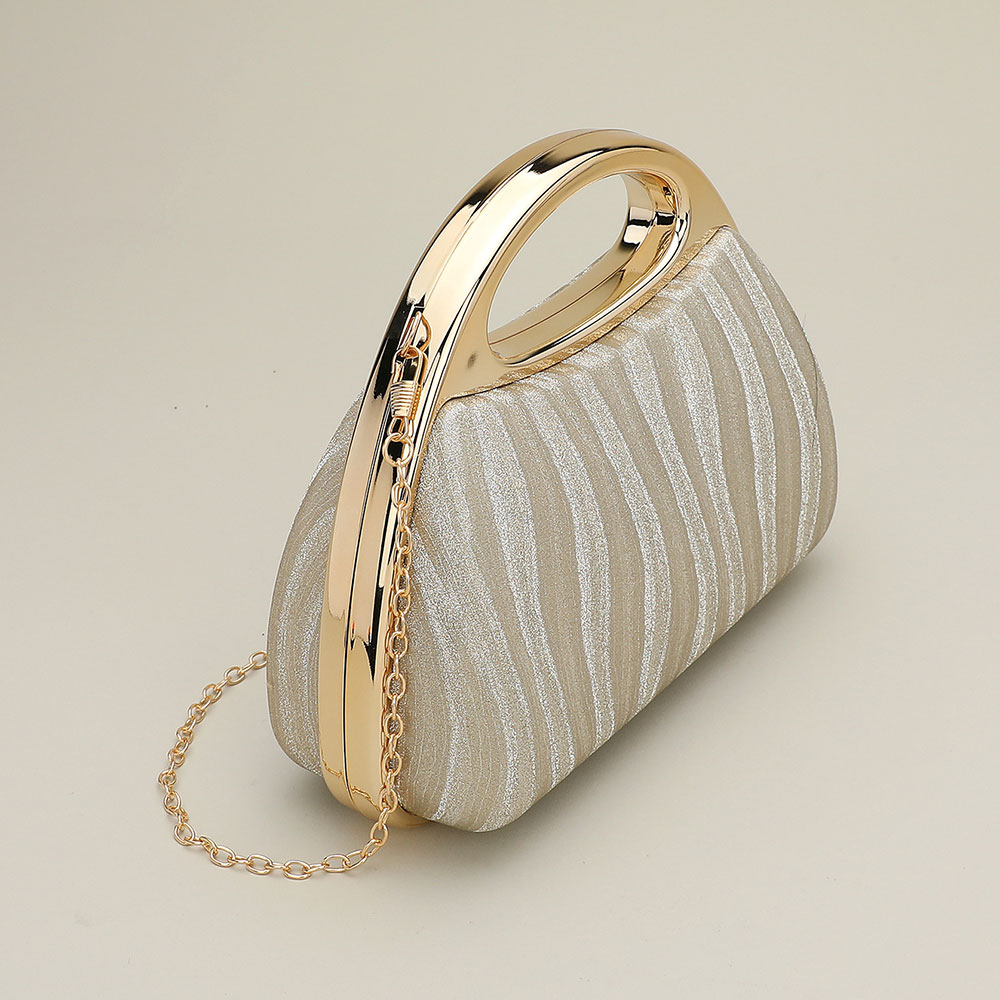 Details • Size : 8.5" X 6.5" X 3" • Top Handle Size : 2" L • Strap Size : 46"L • Clasp Closure • A refined evening handbag featuring a sculpted silhouette, metallic handle, and shimmering textured body. Designed for formal events, it offers a polished finish and a detachable chain for versatile styling, keeping essentials organized while enhancing any sophisticated look.