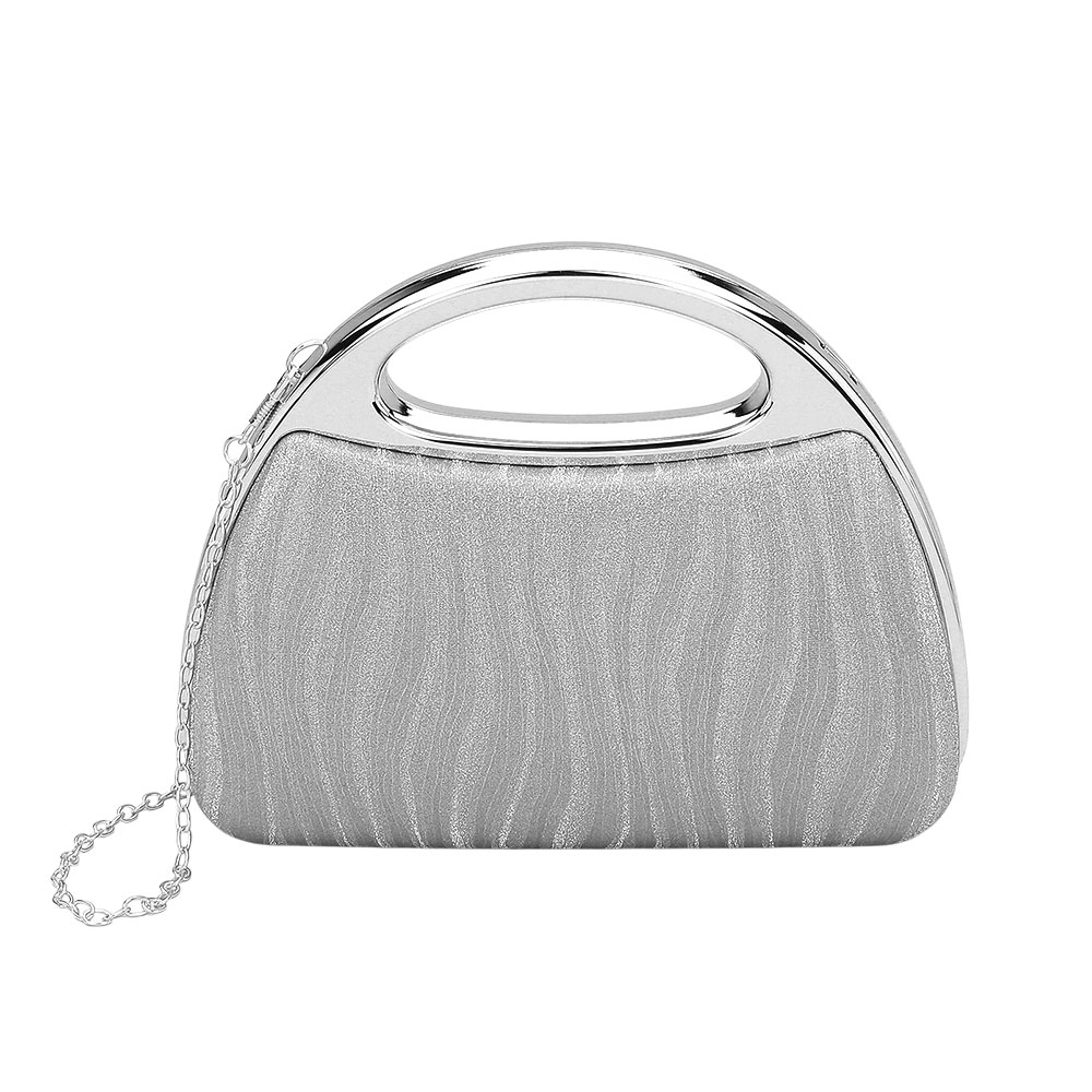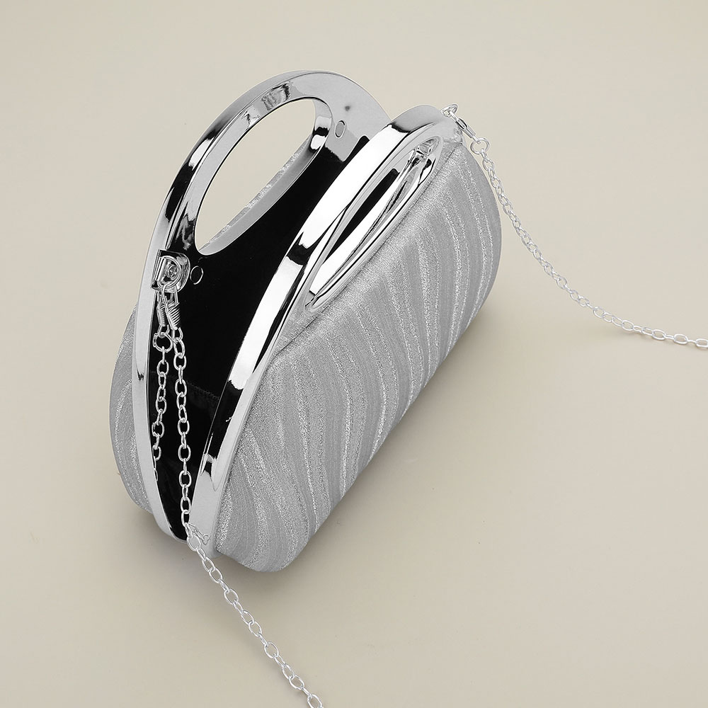 Details • Size : 8.5" X 6.5" X 3" • Top Handle Size : 2" L • Strap Size : 46"L • Clasp Closure • A refined evening handbag featuring a sculpted silhouette, metallic handle, and shimmering textured body. Designed for formal events, it offers a polished finish and a detachable chain for versatile styling, keeping essentials organized while enhancing any sophisticated look.