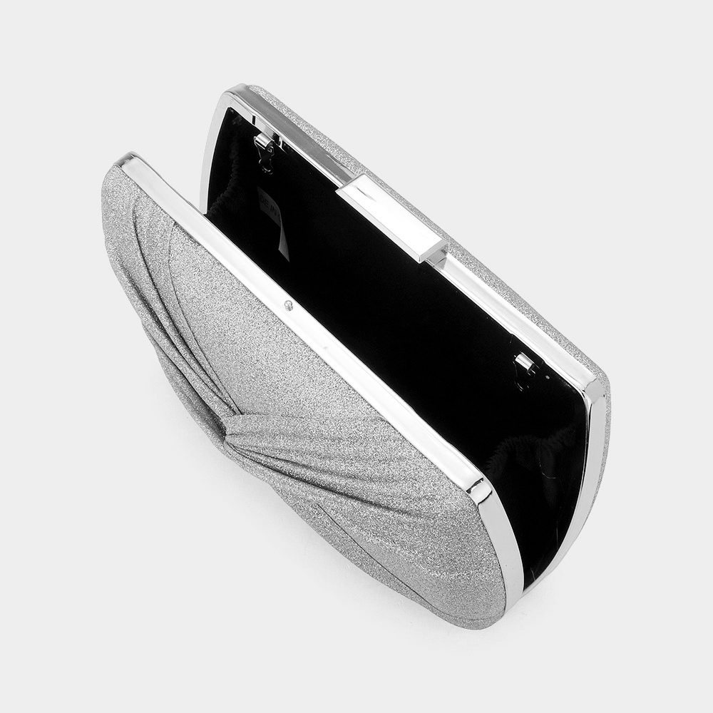 Details • Size : 7" X 2" X 5" • Strap Size : 48" L / Detachable • No Inside Pocket • Clasp Closure • Elevate your style with this silver clutch featuring a shimmering finish and elegant knot detail. Perfect for weddings, parties, or evening events, this chic accessory adds a refined touch to any outfit.