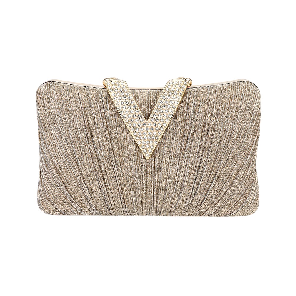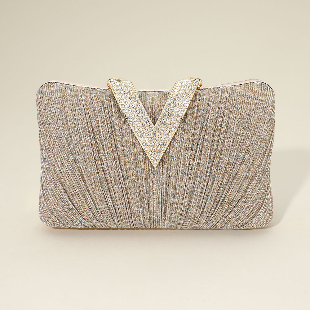 Details • Size : 7.5" X 4.5" X 2" • Strap Size : 47" L / Detachable • Clasp Closure • Sophisticated pleated clutch bag featuring a dazzling rhinestone V-shaped clasp. Perfect for weddings, parties, and formal events, this chic evening handbag adds glamour to any outfit while offering just enough space for your essentials in a refined, timeless design.