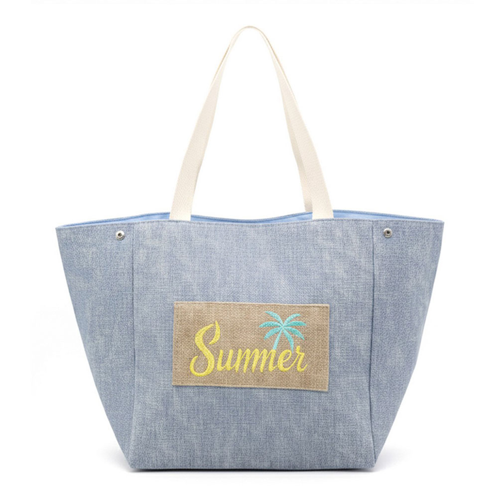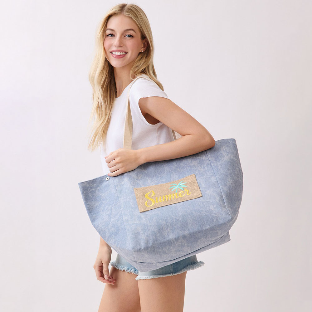 • Spacious everyday tote bag designed with a message patch for casual outings, travel, beach trips, and seasonal retail displays. Features a roomy interior and comfortable shoulder straps, making it ideal for carrying daily essentials, vacation must-haves, and warm-weather lifestyle accessories.