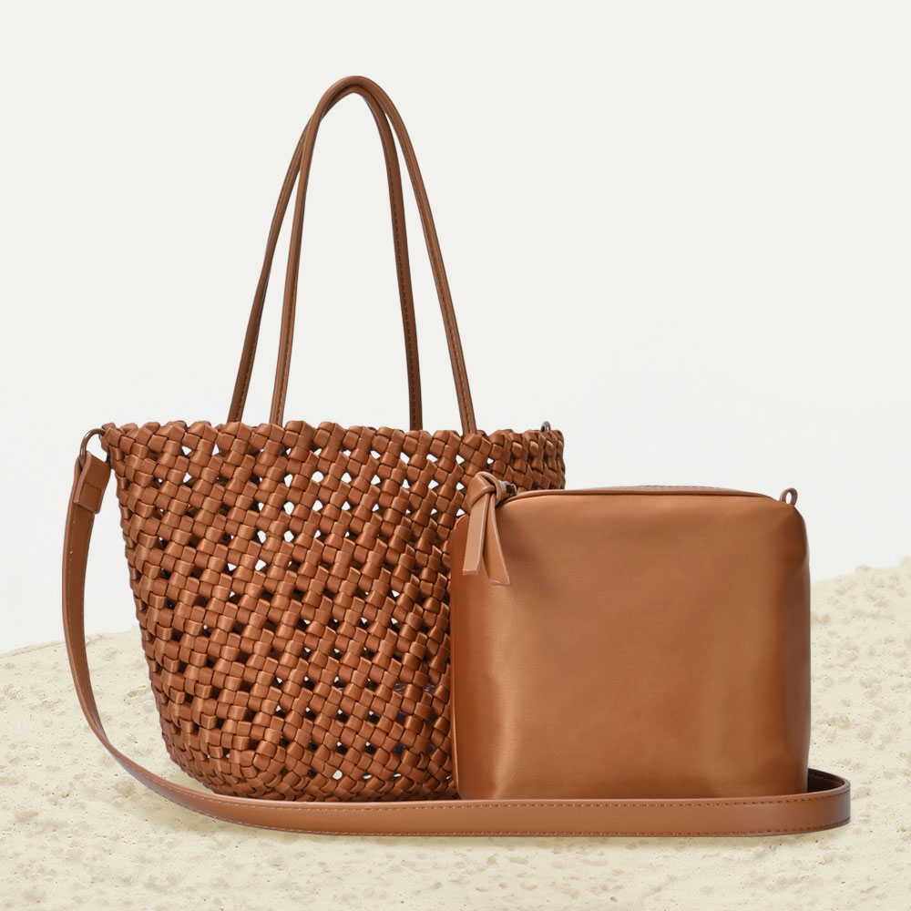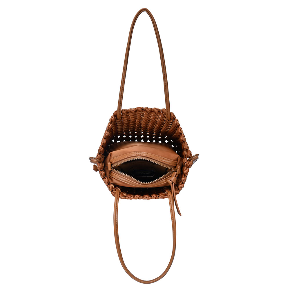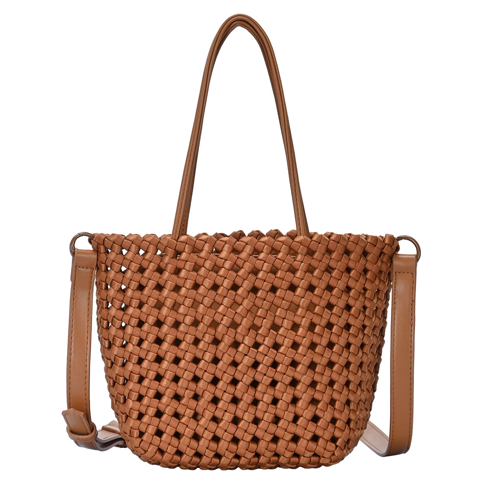 Details • Size : 10" X 7" X 4" • Top Handle Size : 7" L • Inside Pouch Size : 6" X 6" X 3" • Strap Size : 46" L / Detachable, Adjustable • One Inside Zipper Pocket • One Inside Slip Pocket • Zipper Closure • Material : Shell-Nylon, Lining-100%Polyester • Stylish woven tote bag featuring a detachable inner pouch and adjustable strap. Ideal for everyday, work, travel, or shopping. Combines elegance, versatility, and practical storage in one. • Handmade