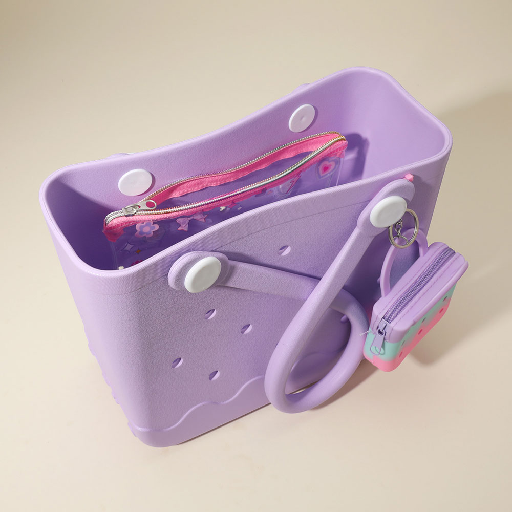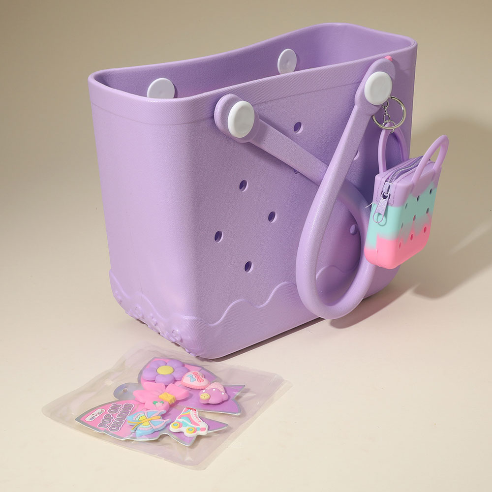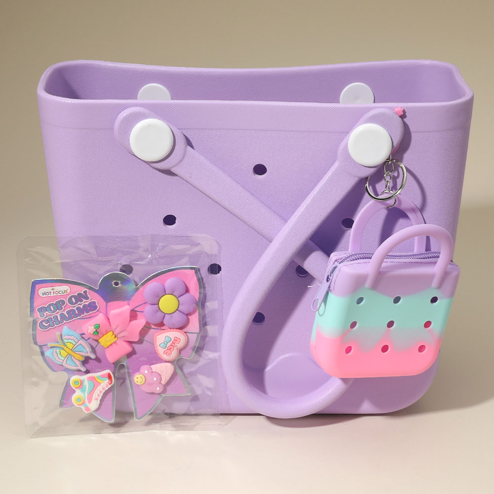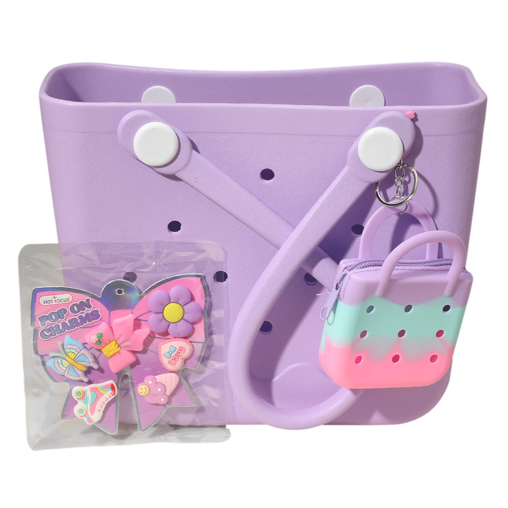 Details • Size : 11" X 8.5" X 4.25" • Top Handle Size : 7.25" L • Silicone Pouch Keychain Size : 5.5" L / 3.6" X 3.25" X 1.2" • Charm Size : 1.2" L • Inside PVC Pouch Size : 4.5" X 4.25" • 1 beach tote bag, 1 silicone pouch keychain, 1 PVC insert bag and 6 pop-up charm included • Fun tote bag set featuring pop-on charms, adjustable handles, and a mini coin pouch. Lightweight and perfect for kids’ outings, playdates, or gift sets. Includes decorative charm pack and keychain pouch.