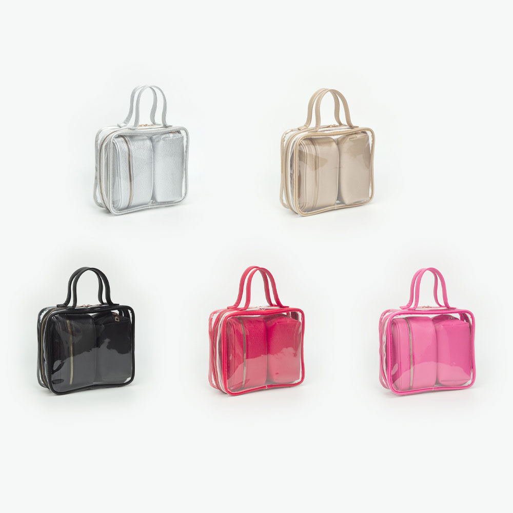 • This 4-piece travel cosmetic bag set features a transparent tote with zip closure and three matching pouches for organized storage. Ideal for toiletries, makeup, and accessories, this compact, durable set makes packing simple and stylish for trips, daily commutes, or gym use.