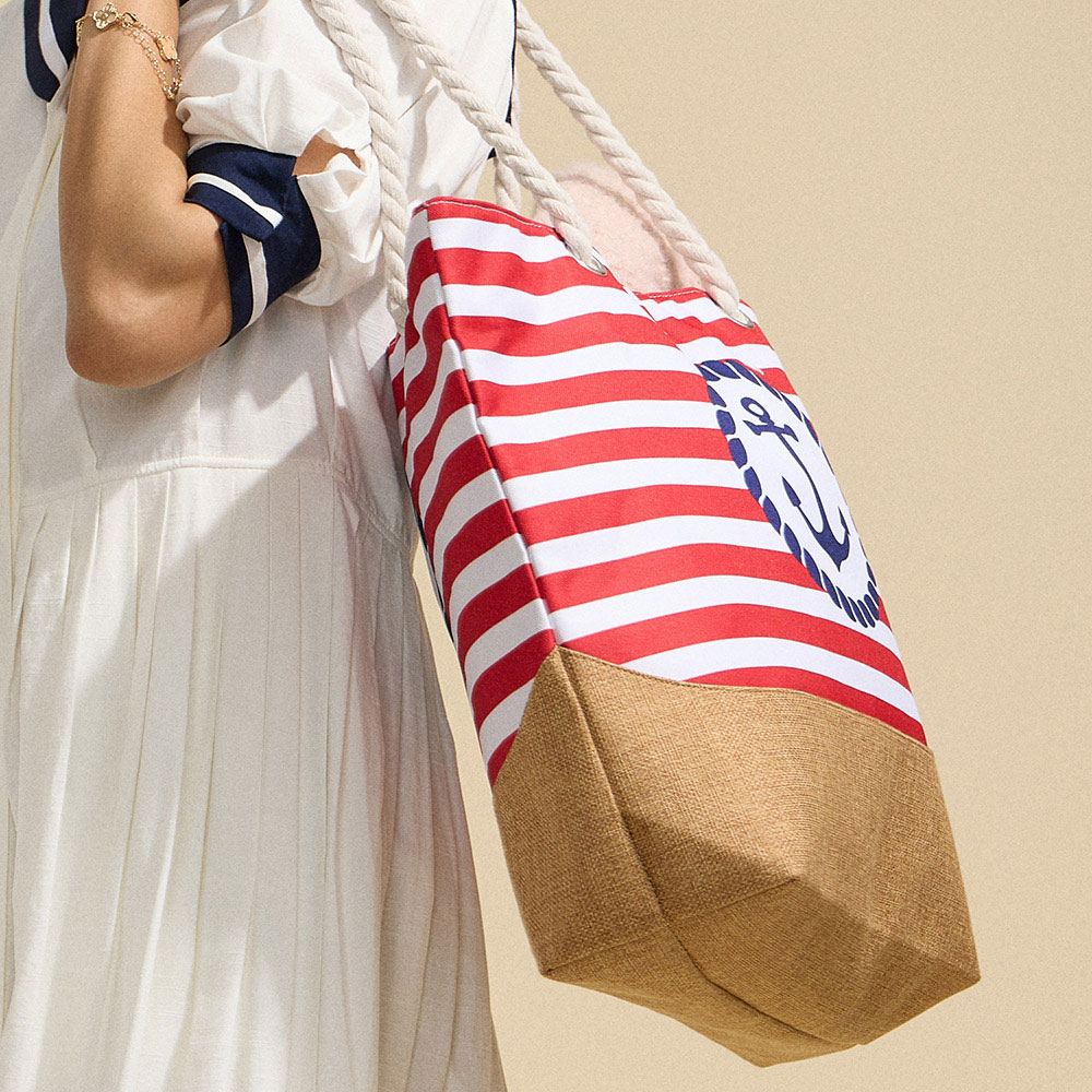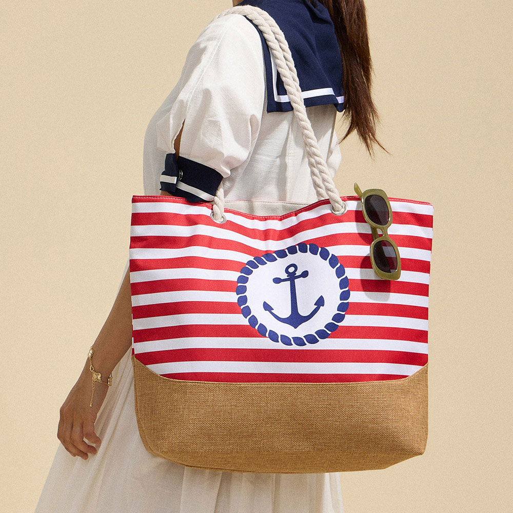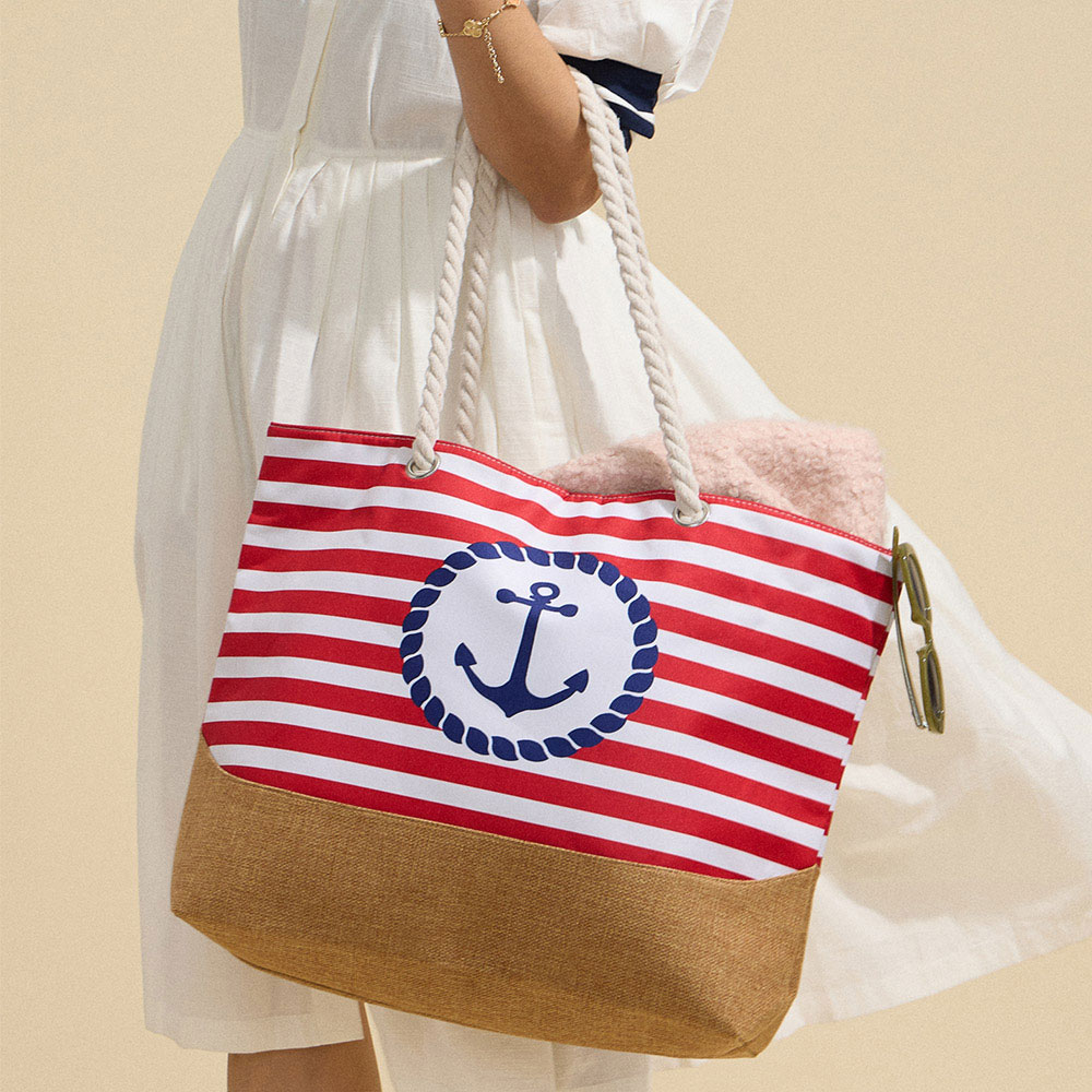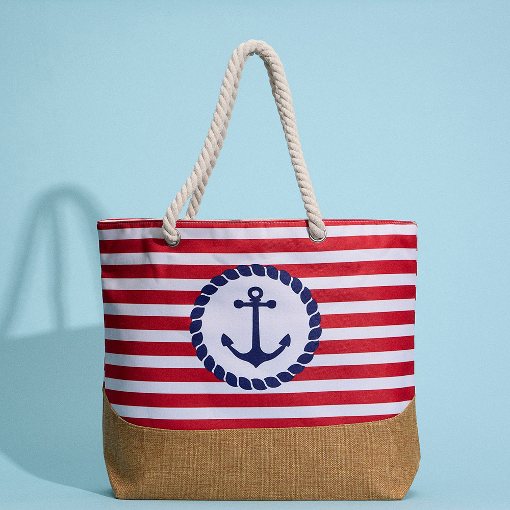 Anchor Printed Striped Rope Handle Beach Tote Bag