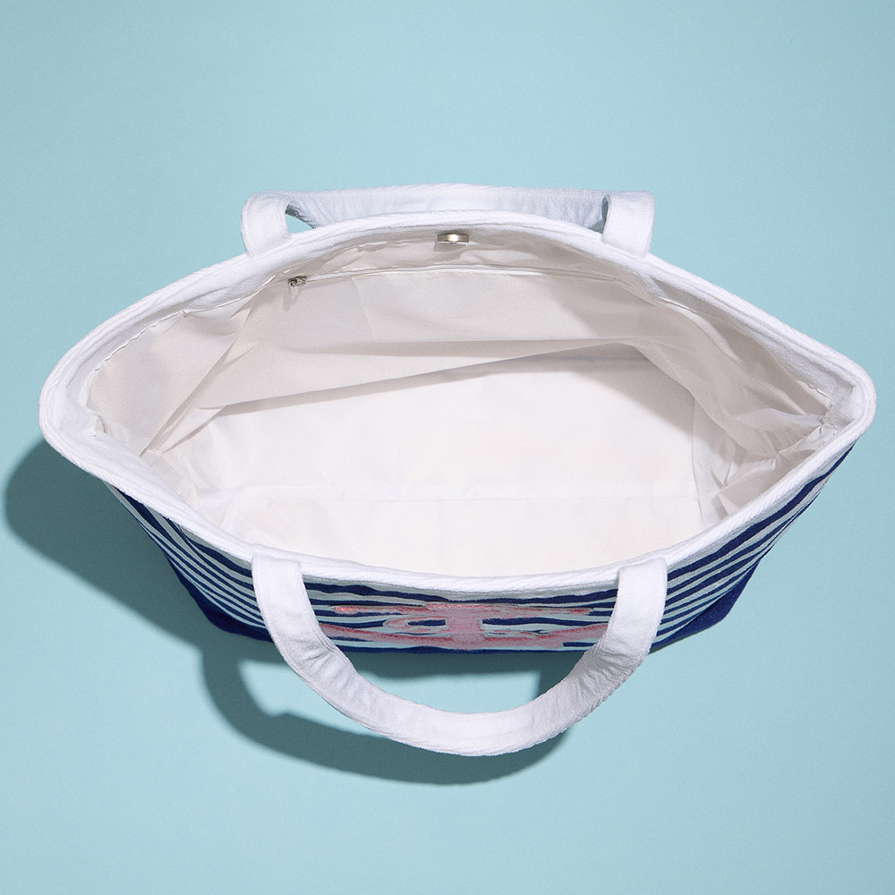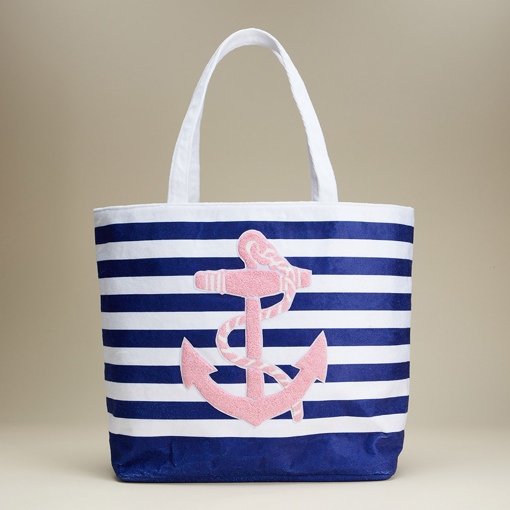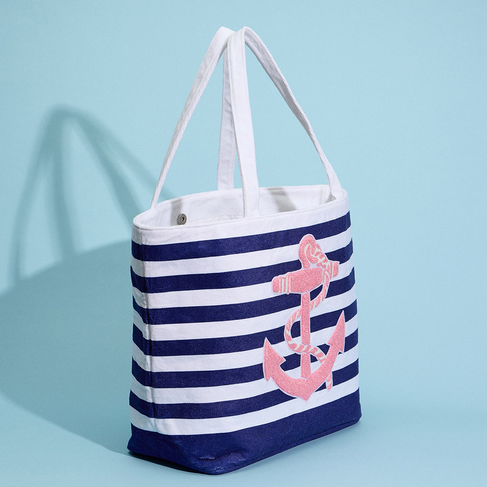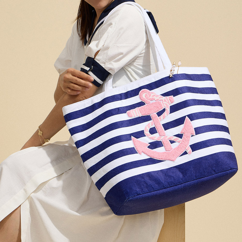 Details • Size : 21.5" X 15" • Material : 90% Polyester, 10% Nylon • Nautical-inspired striped tote bag featuring a bold anchor motif, roomy capacity, and comfortable handles. Perfect for beach outings, travel, or casual everyday style with a fun maritime touch.