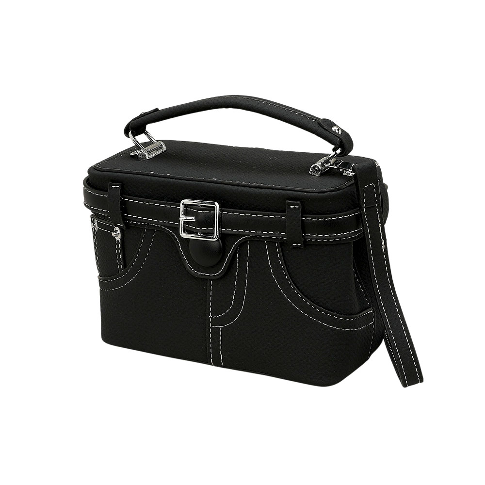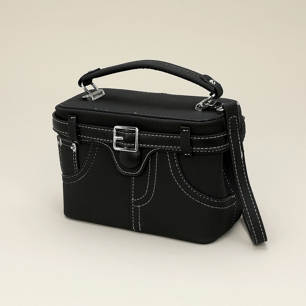 • Compact satchel handbag with stitched pocket design, top handle, and removable strap. Accented with a belt-style buckle, this structured piece blends vintage charm with everyday practicality for a stylish statement.