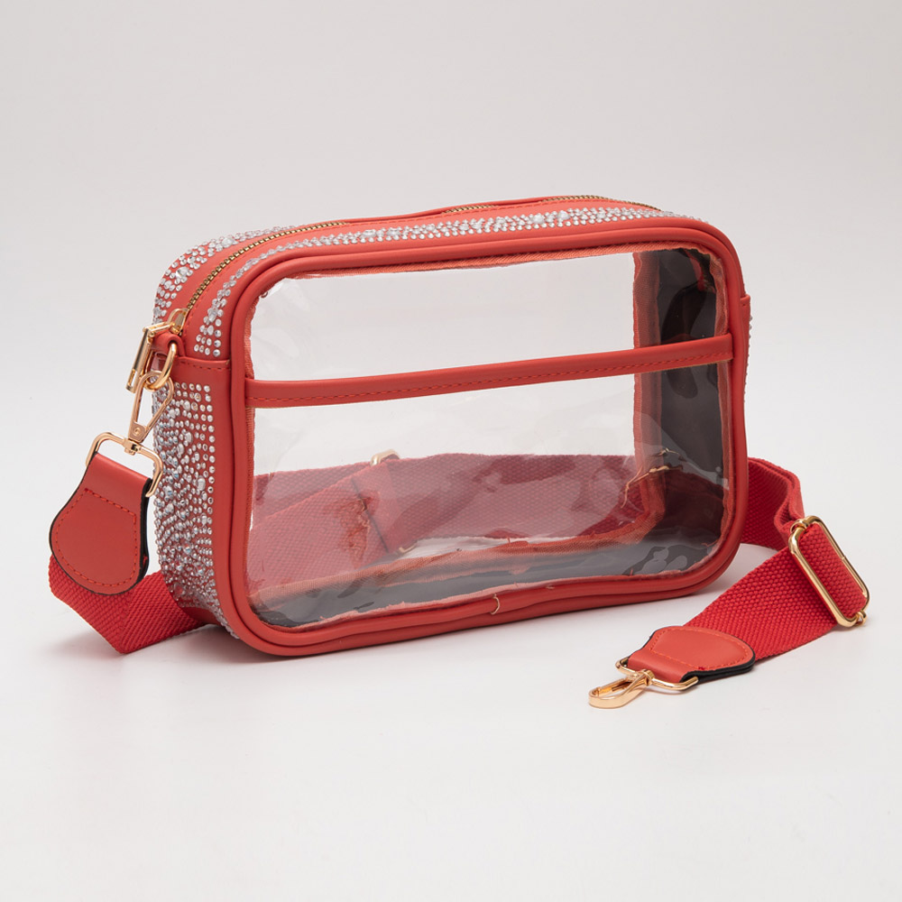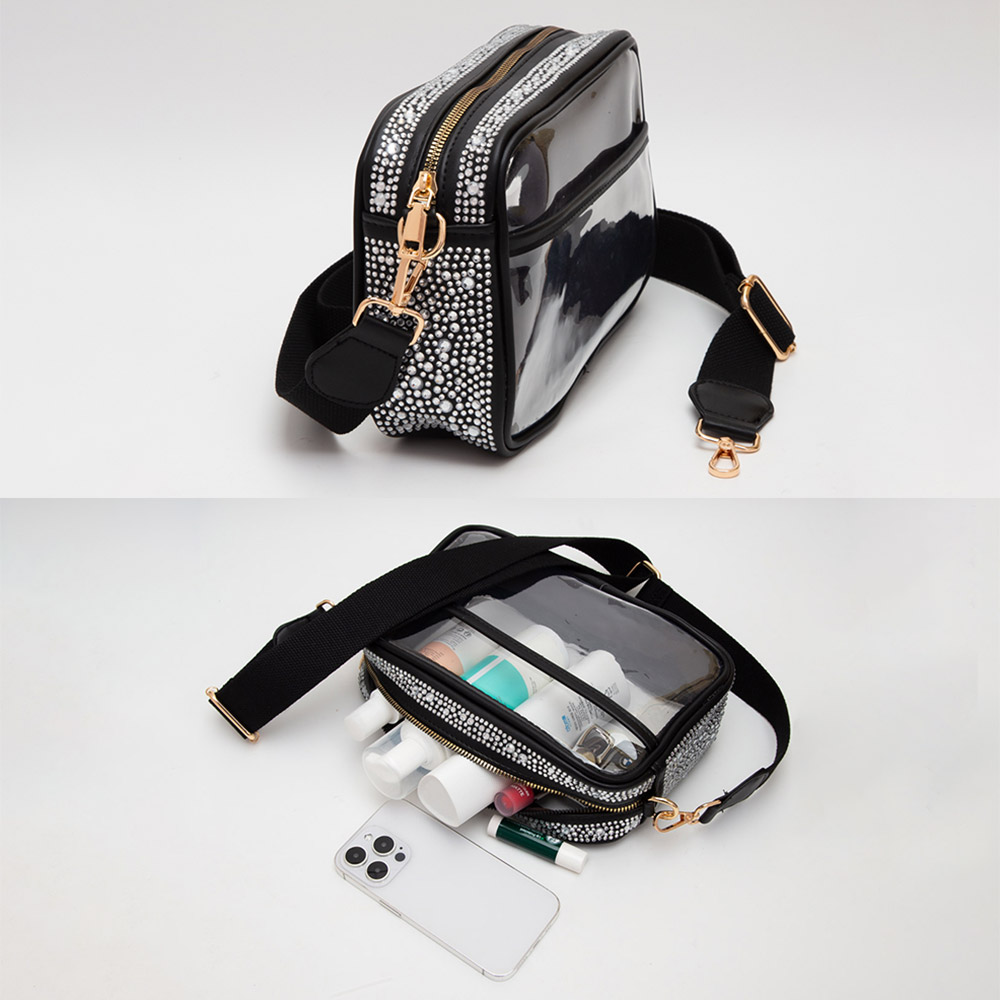 • Elevate your event-ready look with this stylish clear crossbody bag featuring dazzling rhinestone trim, zippered closure, and a wide adjustable strap for comfort. Designed to meet stadium and concert venue requirements while keeping essentials secure and in sight.