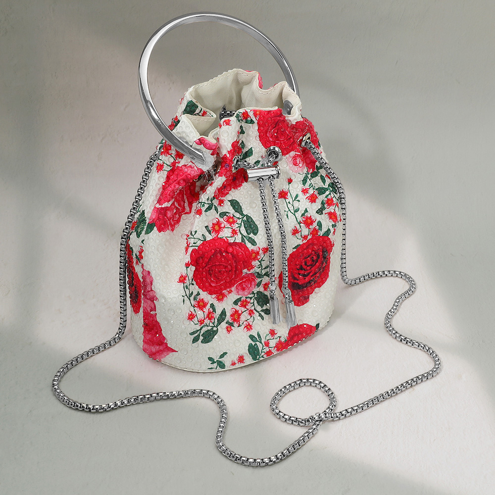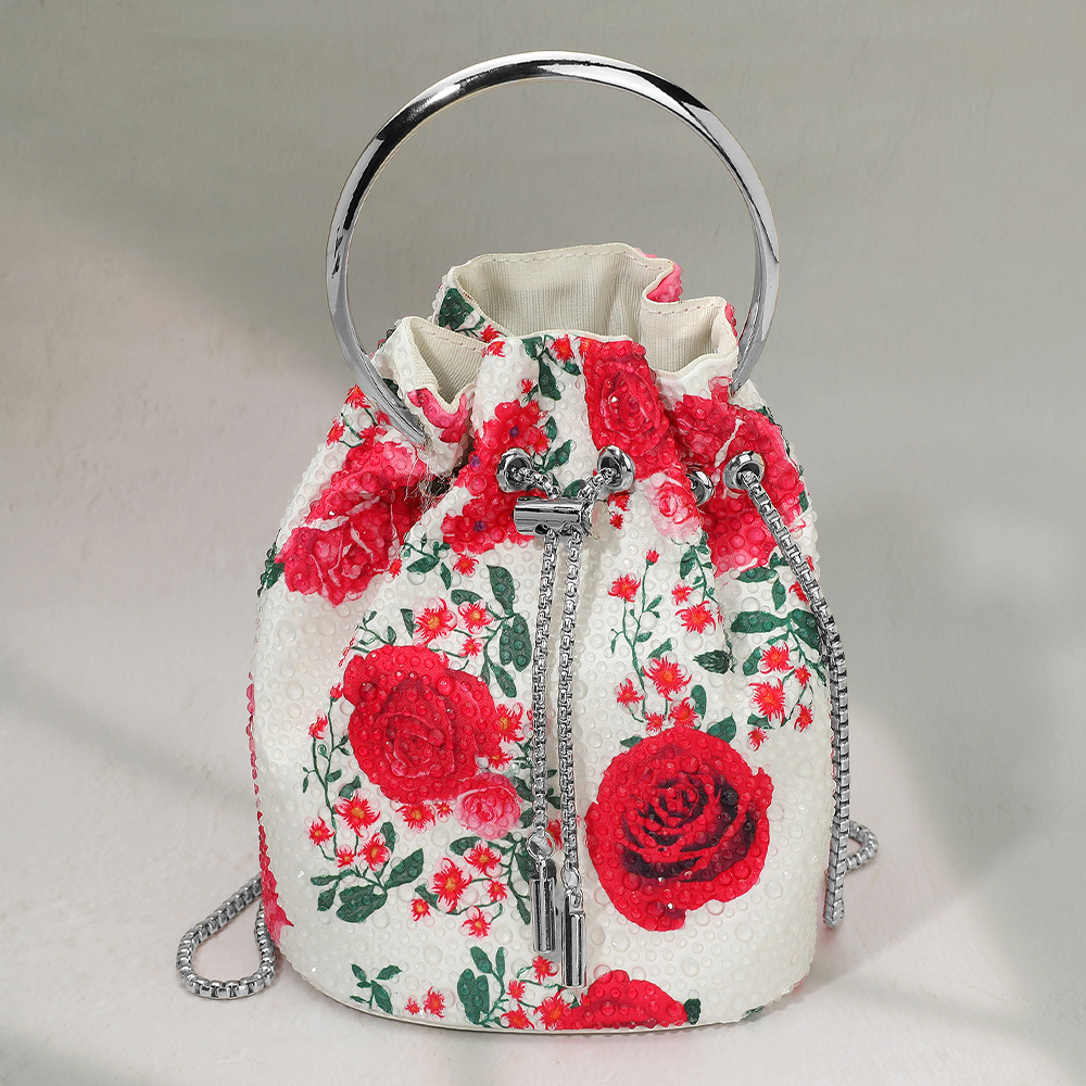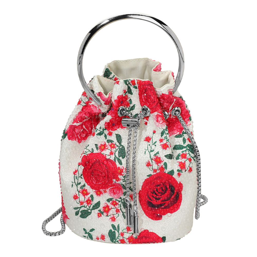 Details • Size : 5.5" X 6.75" X 3.5" • Top Handle Size : 2.75" L • Strap Size : Adjustable • Drawstring Closure • Sparkling floral drawstring bag with crystal accents and a sleek ring handle. Ideal for parties, weddings, and formal occasions, offering both elegance and functionality for carrying essentials.