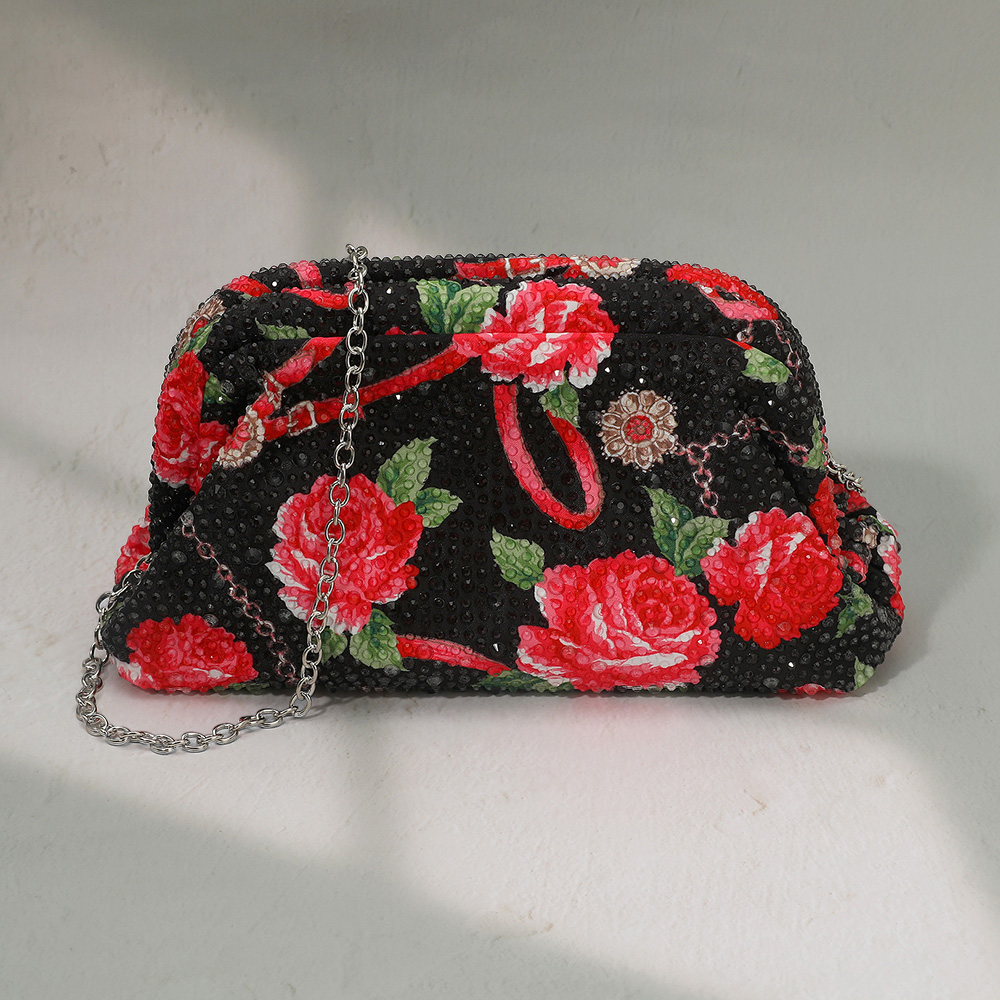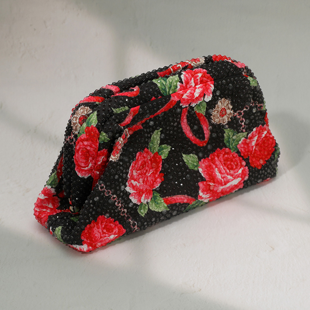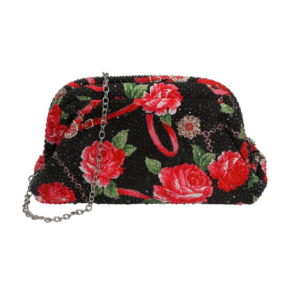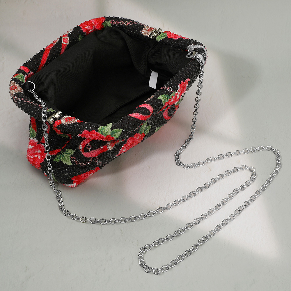 Details • Size : 8.5" X 5" X 2.5" • Strap Size : 47" L Detachable • Sparkling floral pouch with round handle and detachable chain strap. Perfect as an evening clutch or crossbody, ideal for weddings, parties, and elegant occasions.