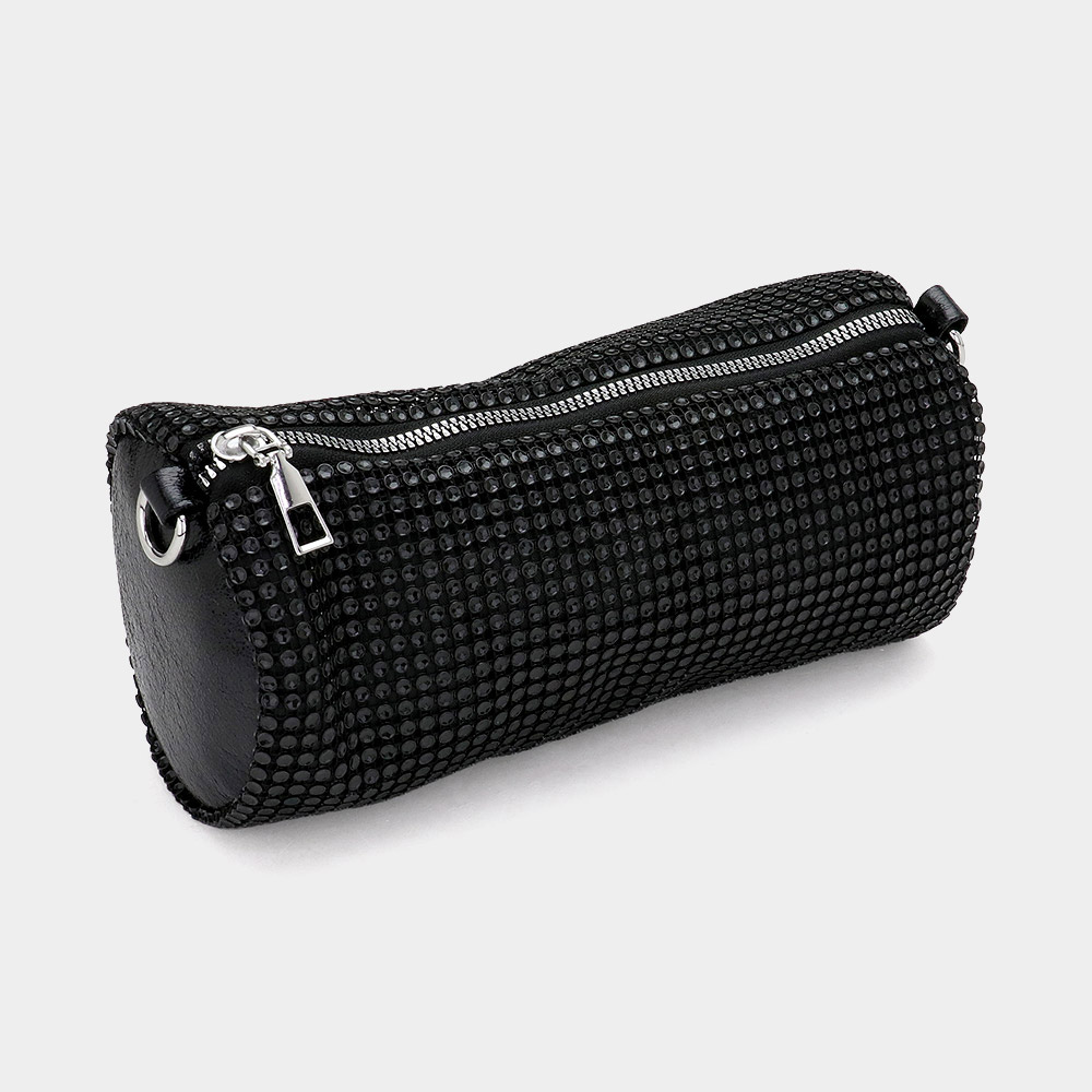 • Elegant cylindrical clutch bag featuring shimmering rhinestone detailing and a secure top zip closure. Ideal for parties, events, or a stylish night out.