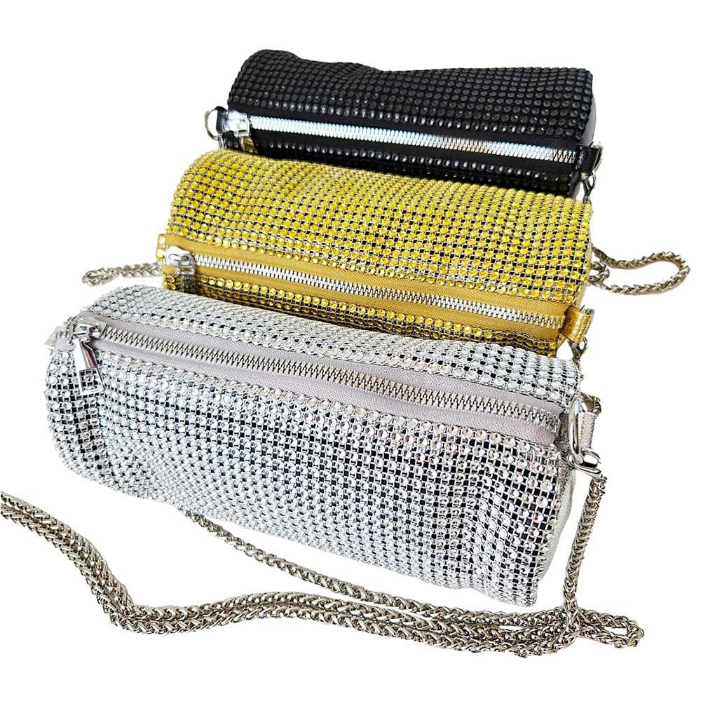 • Elegant cylindrical clutch bag featuring shimmering rhinestone detailing and a secure top zip closure. Ideal for parties, events, or a stylish night out.