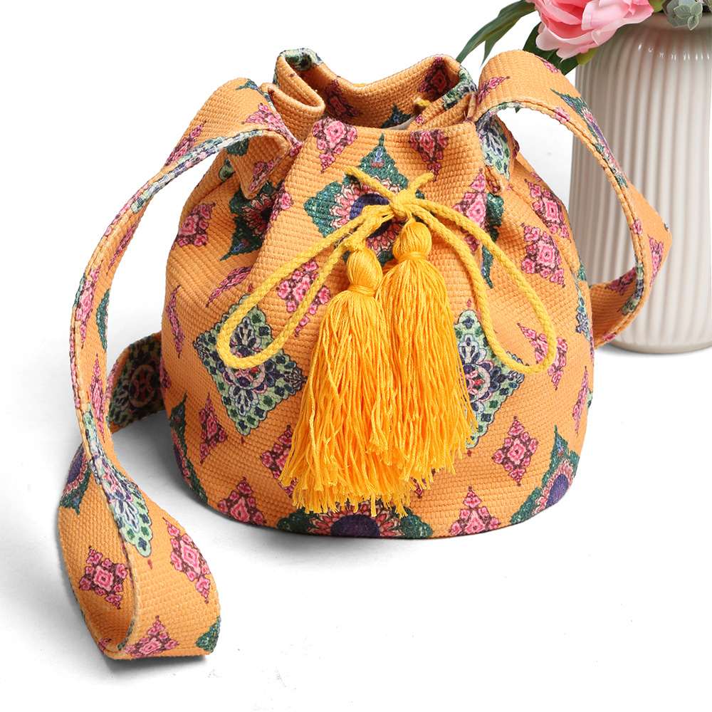 Boho Ikat Pattern Woven Tassel Crossbody Bucket Bag