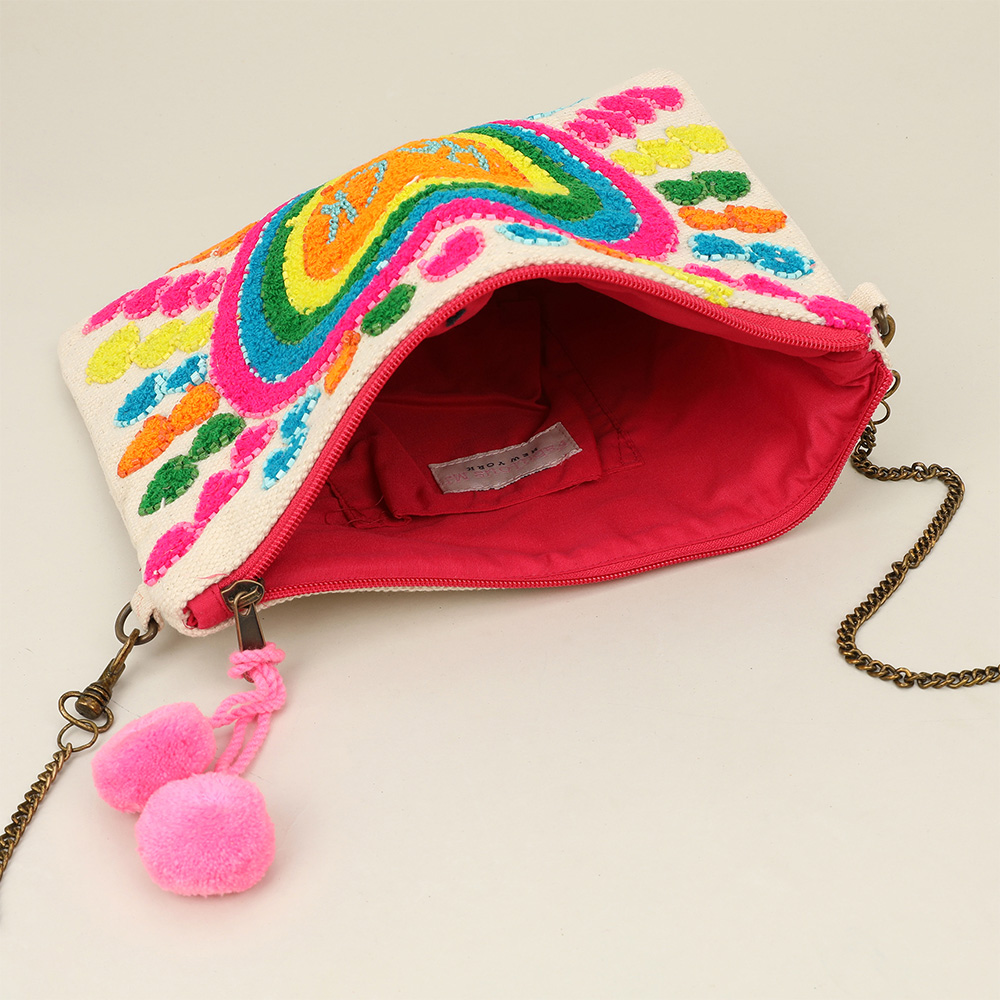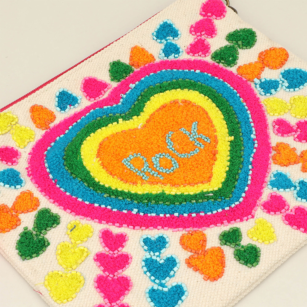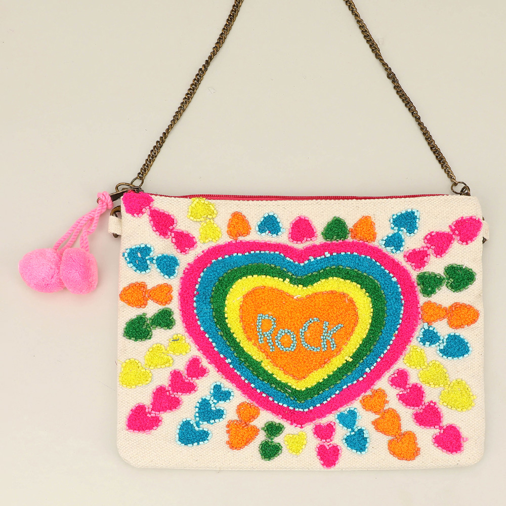 Boho Rainbow Heart Pom Pom Clutch Bag / Crossbody Bag