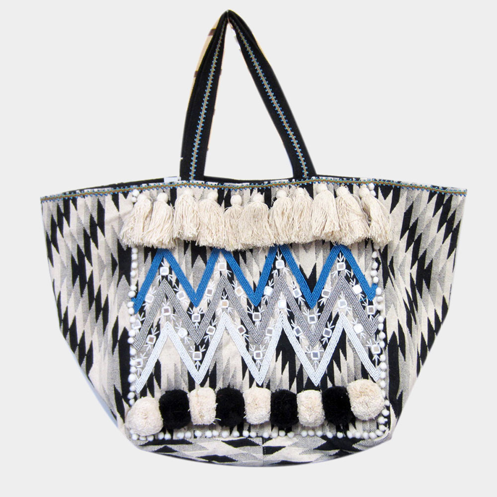 Boho Seed Beaded Zigzag Chevron Detailed Pom Pom Tassel Shoulder Bag
