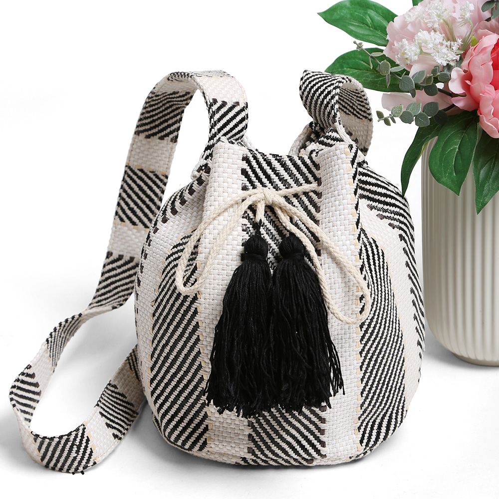 Details • Size : 9" X 8" X 9.5" • Material : 50% Cotton, 50% PP • Ample room for daily essentials like a phone, wallet, and keys • Tassel drawstring closure adds a stylish flair while ensuring security • Easy to carry as a crossbody or shoulder bag • Perfect for casual outings, vacations, and daily errands
