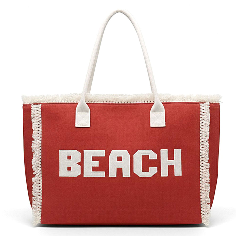 Bold BEACH Letter Embroidered Fringe Tote Bag