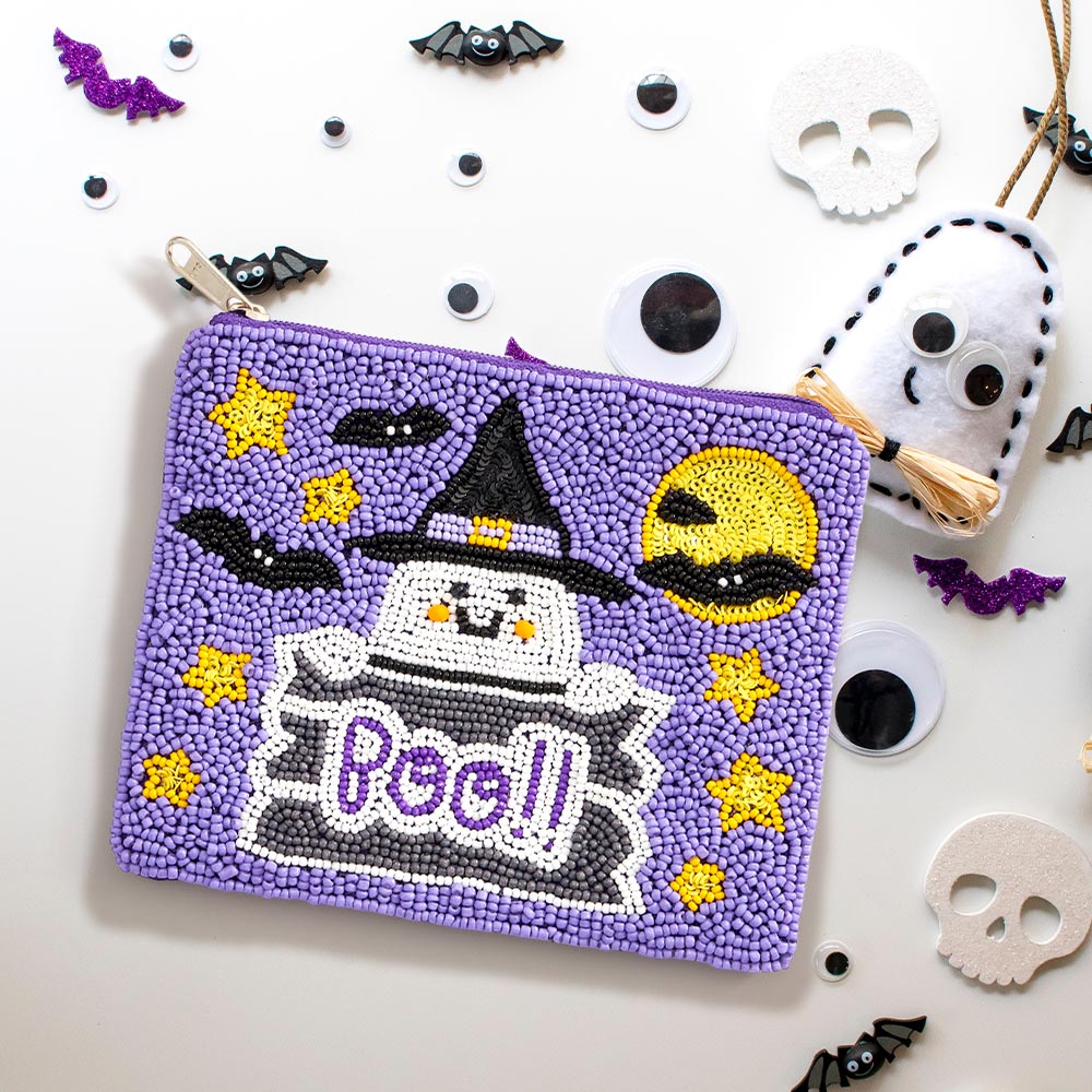 Details • Bag Size : 5.25" X 4.5" • No Inside Pocket • Beads on Front Only • Zipper Closure • Celebrate spooky season with this beaded Halloween pouch featuring a ghost in a witch hat and “Boo!!” text. Perfect for carrying essentials to fall festivals, trick-or-treat nights, or themed parties. Whimsical and festive with eye-catching charm. • Made In India