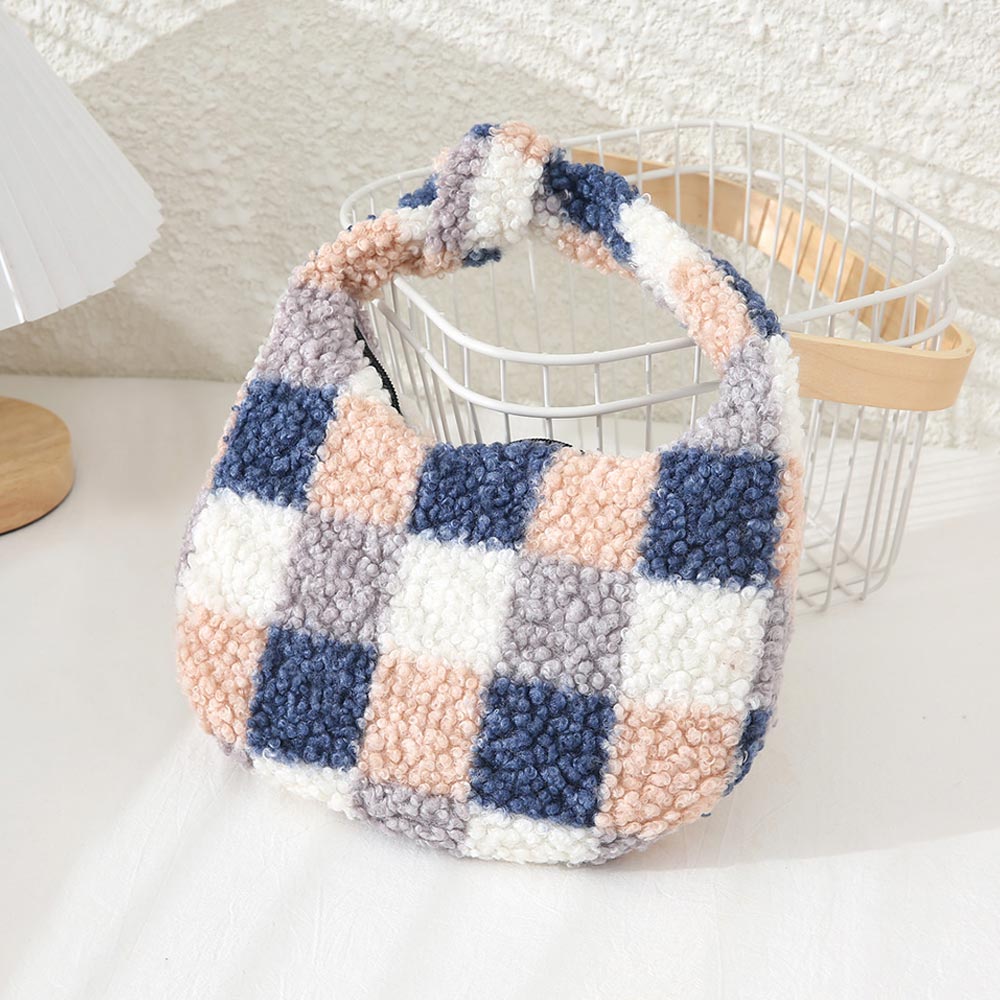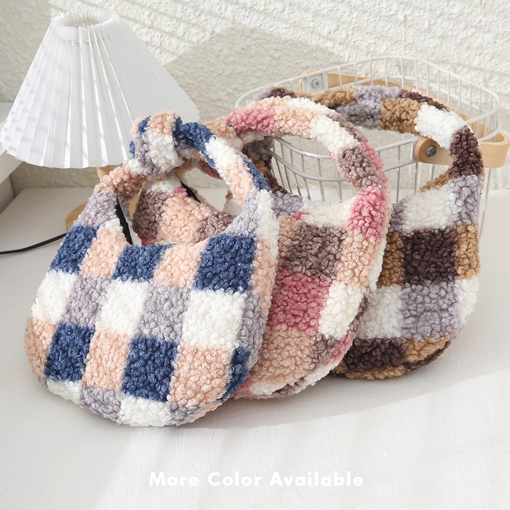 Checker Pattern Teddy Bear Faux Fur Mini Tote Bag