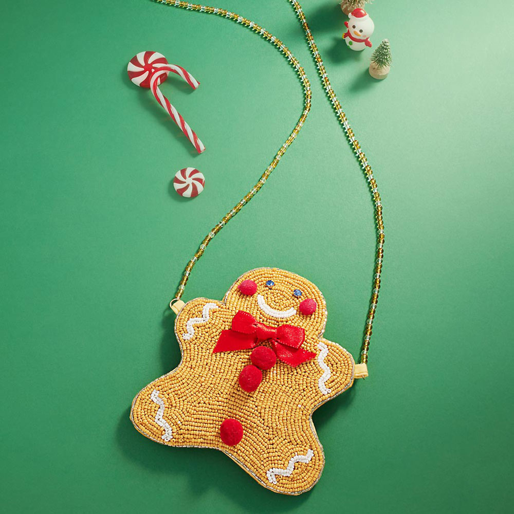 Details • Size : 5.25" X 5.6" • Strap Size : 42" L • Beads On Front Only • Magnetic Closure • Charming gingerbread man-shaped crossbody bag with festive details and whimsical appeal. A perfect novelty accessory for holiday outfits, seasonal events, or gifting during the Christmas season. • Made In India