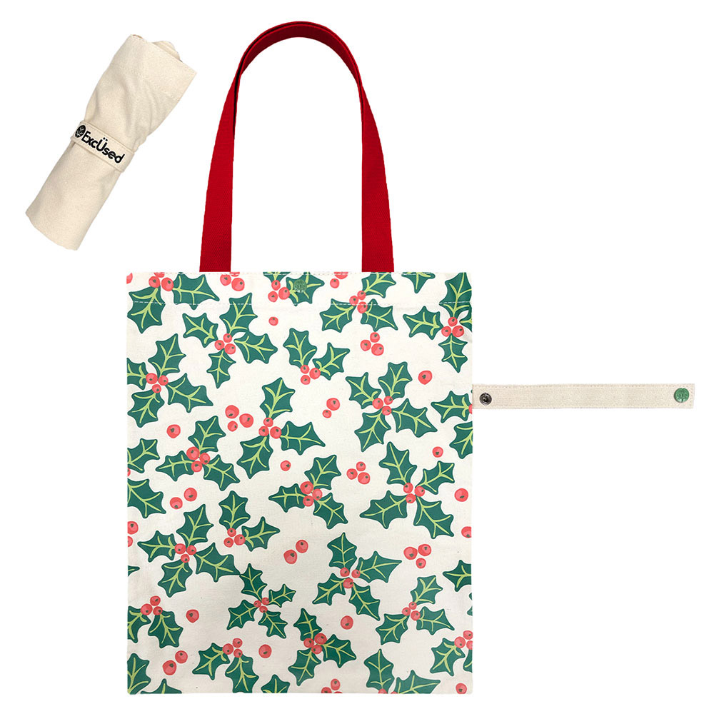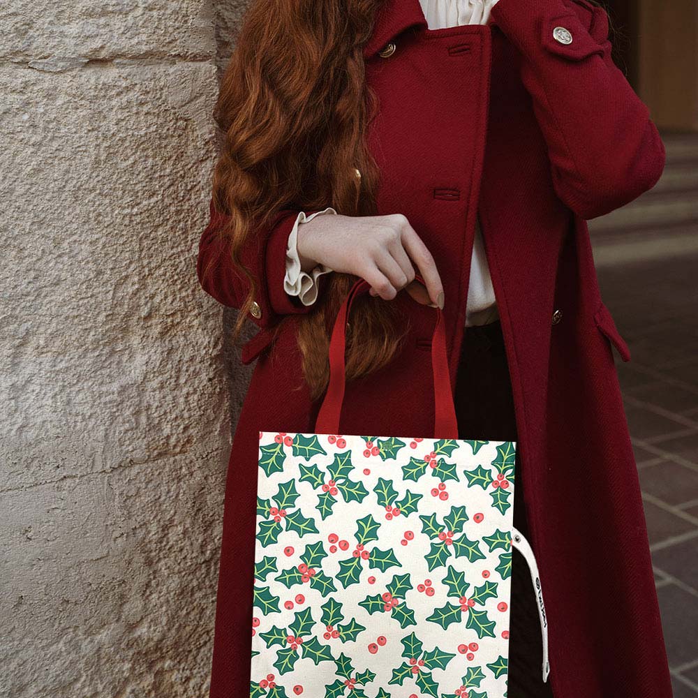 Details • Size : 14" X 16", 10" L • Easy to Fold • Sturdy and Lightweight • Reusable and Washable • Reusable Christmas tote bag featuring a festive holly and berry print. Ideal for holiday shopping, gifting, or seasonal outings. Durable and stylish, it's a cheerful addition to your holiday essentials.