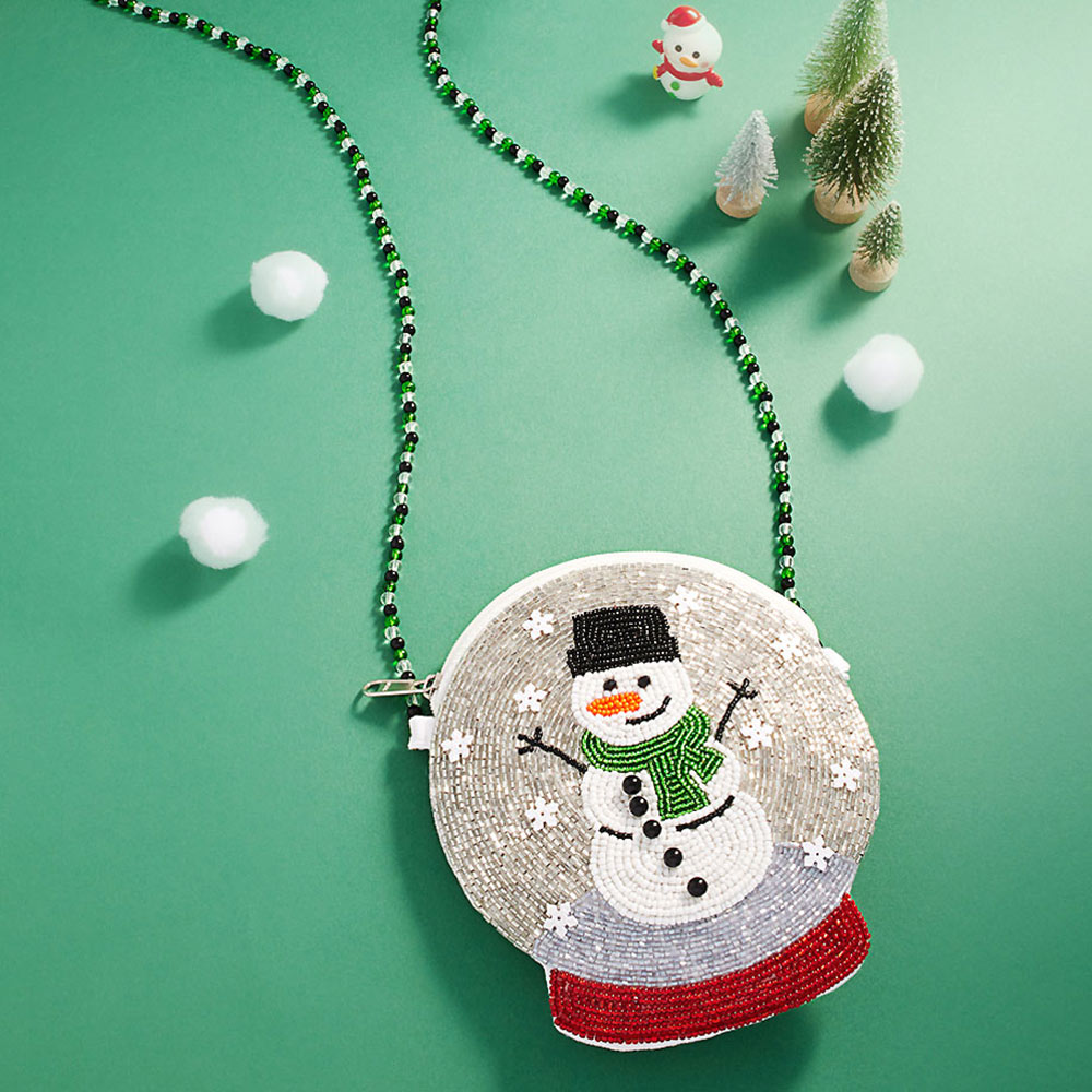 Details • Size : 5.25" X 5.75" • Strap Size : 42" L • Beads On Front Only • Zipper Closure • Festive crossbody bag shaped like a snow globe with a cheerful snowman, glittery finish, and seasonal charm. Great for holiday parties, winter outings, or gifting during the festive season. • Made In India