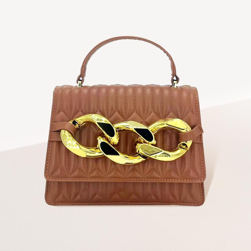 Details • Size : 9" X 7" X 2.75" • Top Handle Size : 3" L • Crossbody Strap Size : Adjustable / Detachable • Magnet Closure • One Inside Zipper Closure • One Inside Slip Pocket • Stylish quilted handbag featuring a bold gold chain detail and structured top handle. Designed with a spacious interior and secure closure, this versatile purse is perfect for both casual outings and elegant occasions, offering a modern blend of fashion and function.