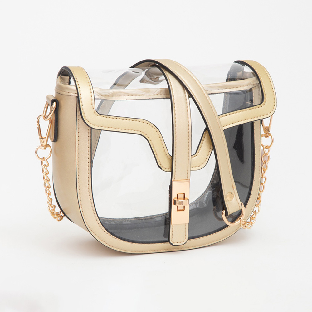 • Stylish clear saddle bag featuring a structured silhouette, gold-tone chain accents, and secure turn-lock closure. Designed with a comfortable crossbody strap, this transparent bag blends elegance with practicality for events, concerts, or everyday outings.