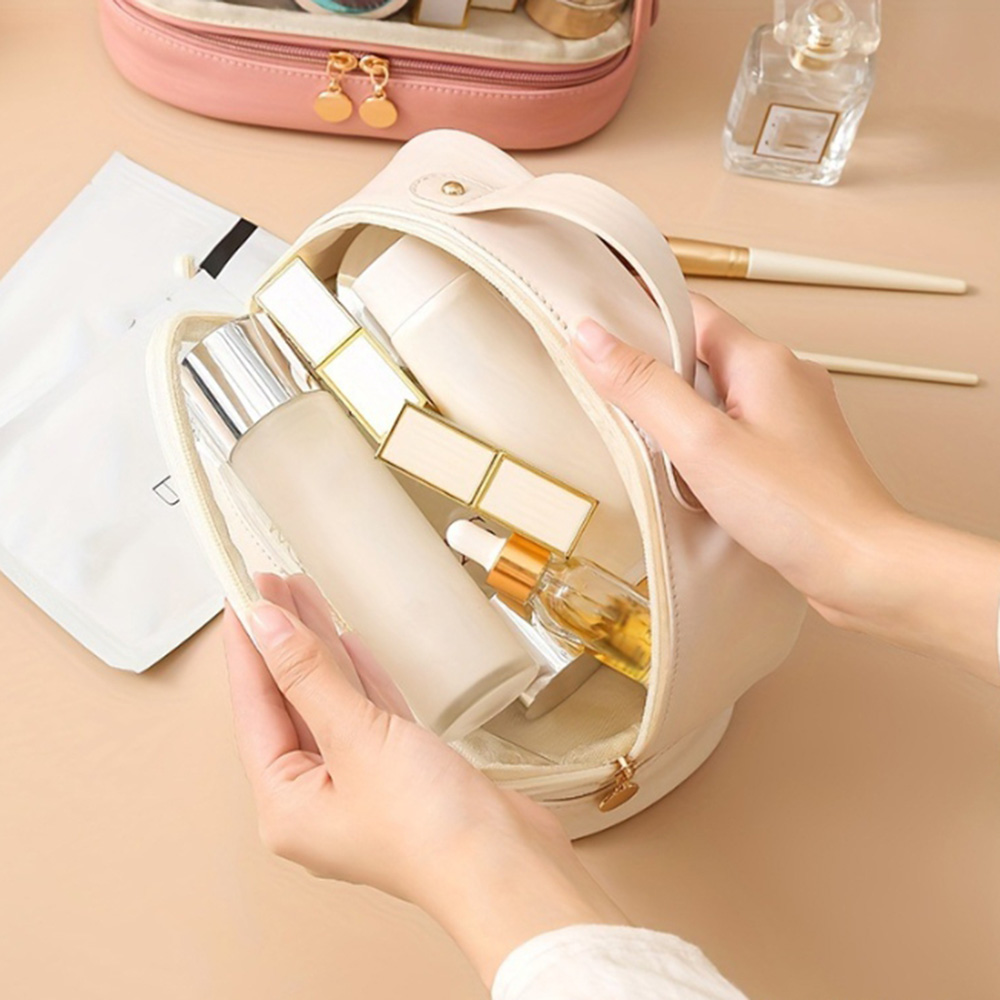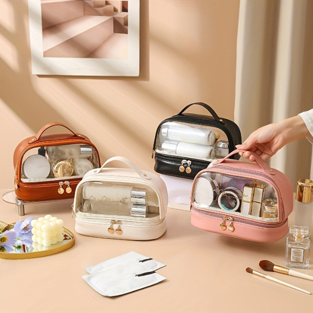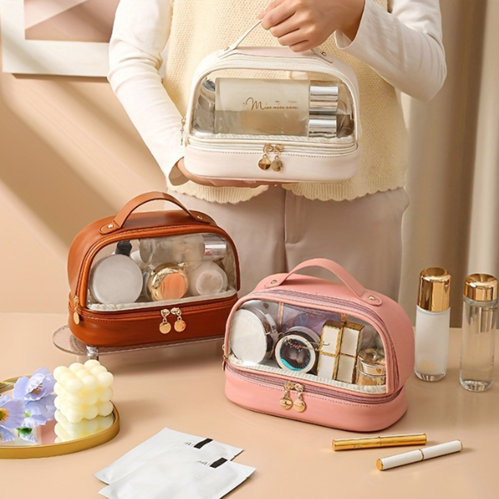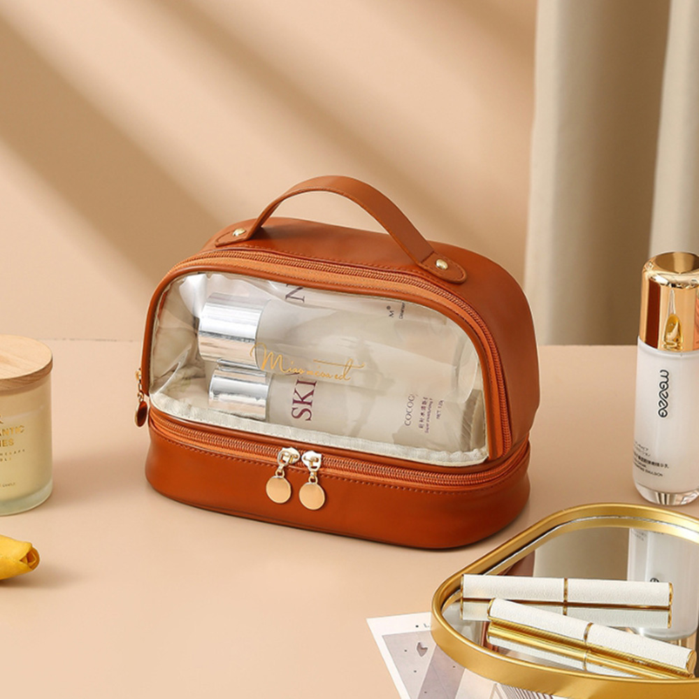 Details • Size : 9" X 6.3" X 5.3" • Zipper Closure • Material : 100% PU • Organize beauty essentials with this brown transparent cosmetic travel bag featuring a clear top and spacious double-layer design. Perfect for storing makeup, toiletries, and skincare, it offers easy access, durability, and style, making it an ideal organizer for home or travel use.