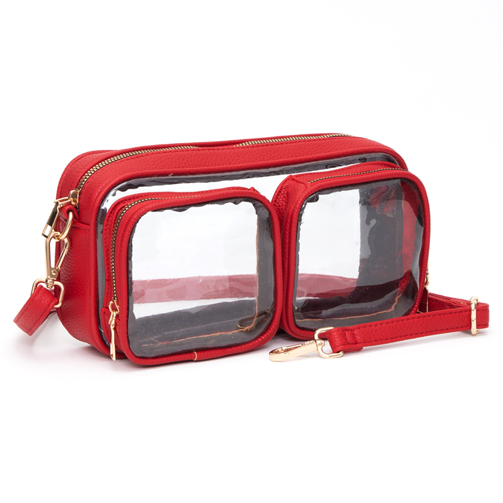 Details • Size : 10" X 4" X 5" • Strap Size : 41" L / Adjustable, Detachable • 2 Outside Zipper Pockets • Zipper Closure • Stay organized and event-ready with this clear stadium crossbody bag featuring dual front zip pockets and an adjustable strap. Compliant with venue regulations and perfect for concerts, sports games, and travel.