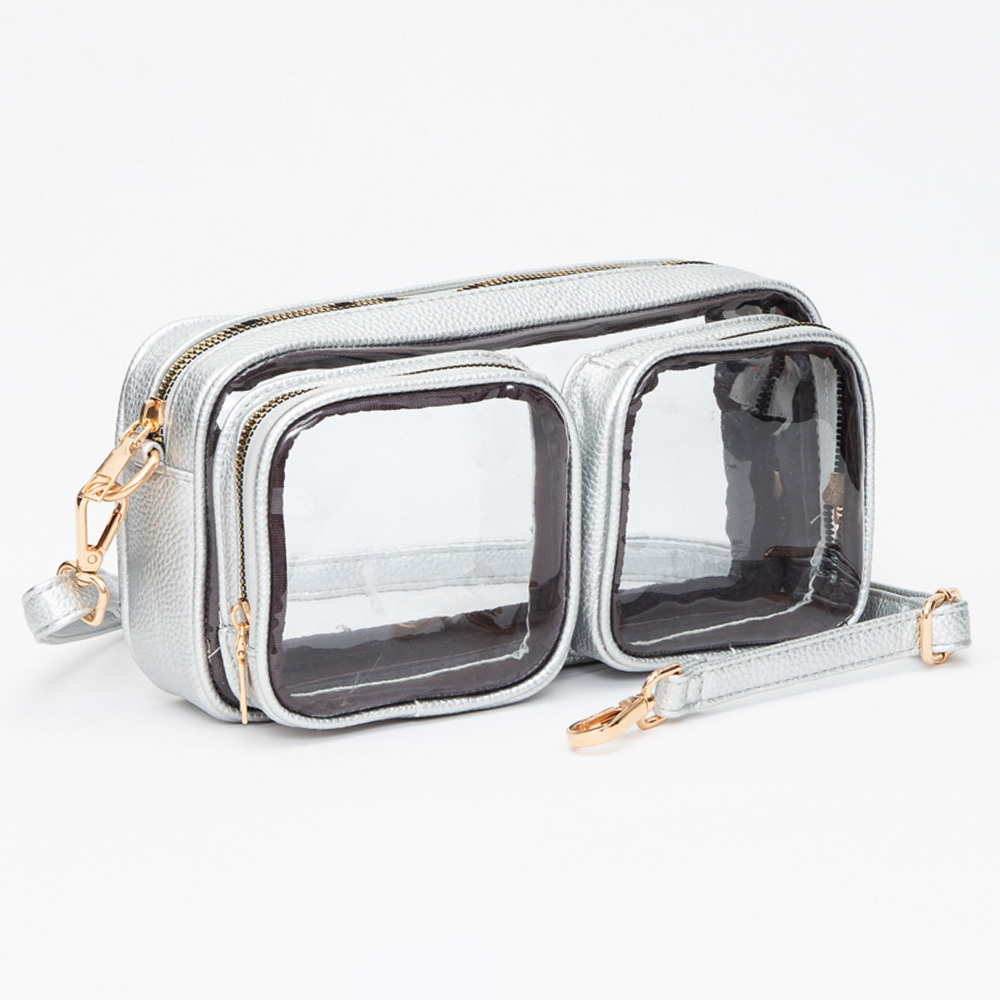 Details • Size : 10" X 4" X 5" • Strap Size : 41" L / Adjustable, Detachable • 2 Outside Zipper Pockets • Zipper Closure • Stay organized and event-ready with this clear stadium crossbody bag featuring dual front zip pockets and an adjustable strap. Compliant with venue regulations and perfect for concerts, sports games, and travel.