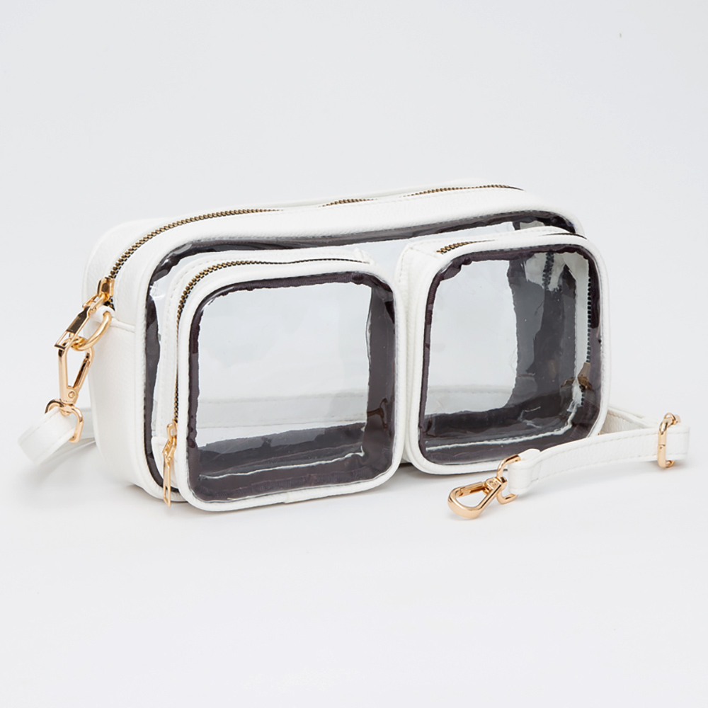 Details • Size : 10" X 4" X 5" • Strap Size : 41" L / Adjustable, Detachable • 2 Outside Zipper Pockets • Zipper Closure • Stay organized and event-ready with this clear stadium crossbody bag featuring dual front zip pockets and an adjustable strap. Compliant with venue regulations and perfect for concerts, sports games, and travel.