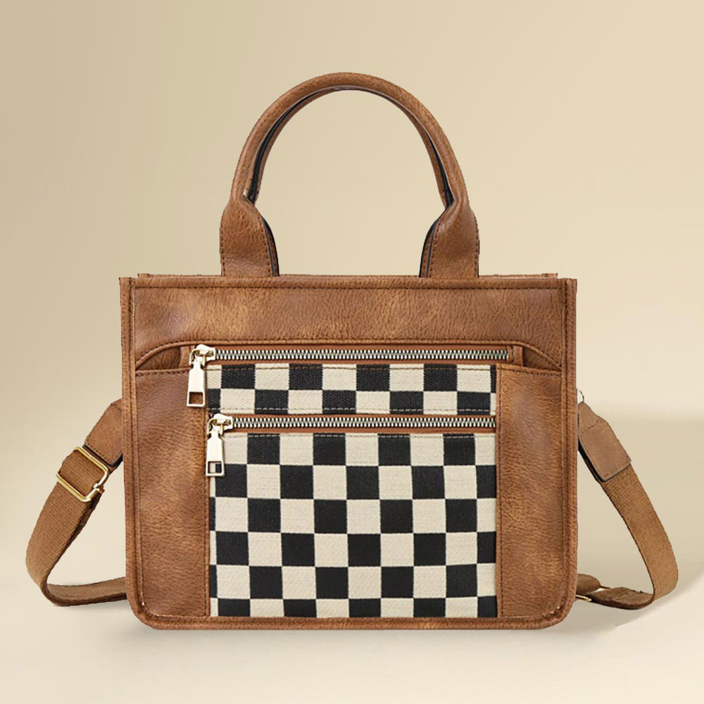 Details • Size : 11" X 8.46" • Material : 100% PVC / Polyester • Strap : Adjustable • 4 Outside Zipper Pocket • Elevate your look with this brown checkered faux leather tote bag. Featuring dual front zip pockets, top handles, and an adjustable strap, it's perfect for daily use with a touch of bold style.
