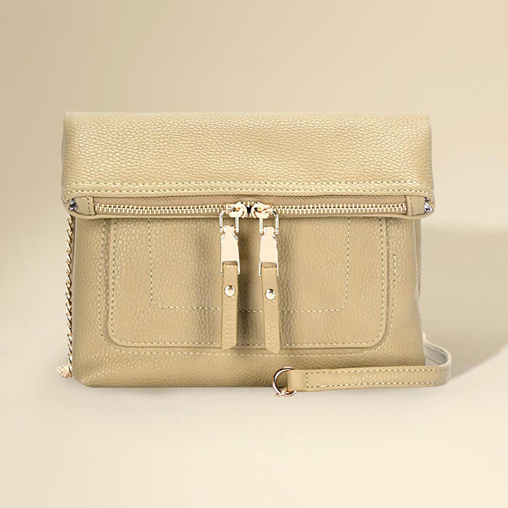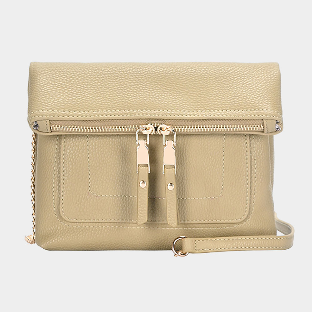 • Elevate your look with this crossbody clutch featuring a sleek fold-over flap and dual zipper accents. Designed with a slim chain strap, this compact handbag offers the perfect mix of elegance and practicality for day-to-night wear.