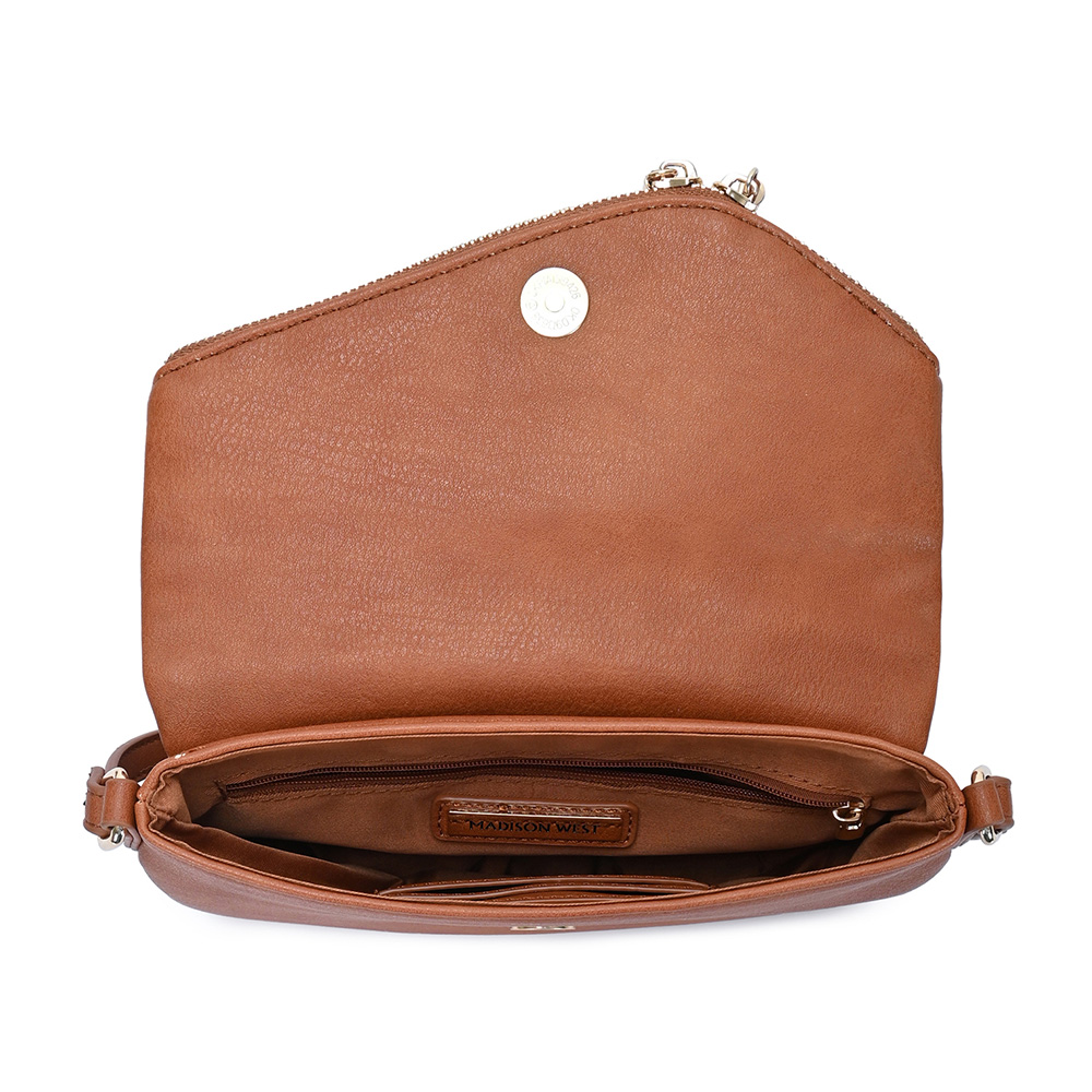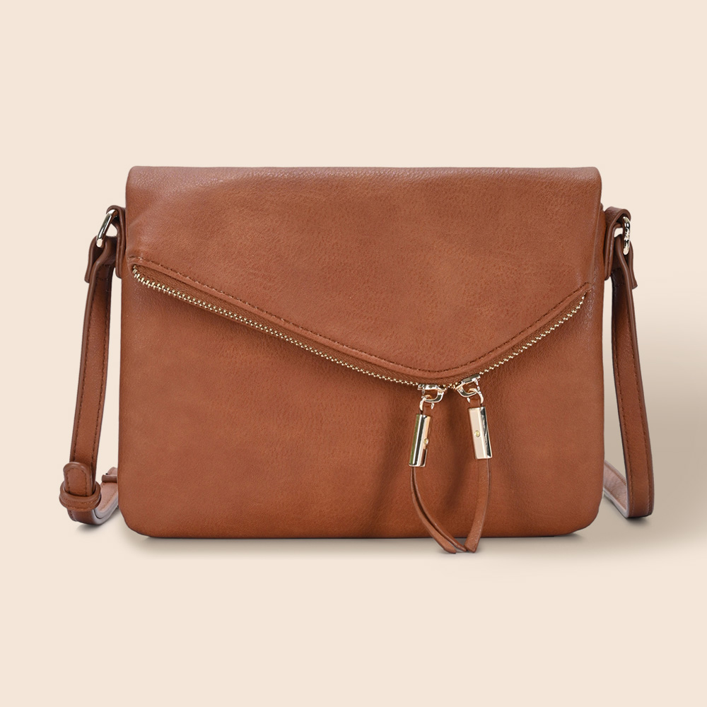 Details • Size : 8.5" X 6.5" X 1.5" • Strap Size : 52" L / Adjustable • 3 Inside Card Slots • 1 Inside Zipper Pocket • Magnetic Closure / Zipper Closure • Material : Shell-100%PU, Lining-100%Polyester • Chic faux leather crossbody bag with envelope flap, gold zip detail, and adjustable strap. Ideal for casual outings or travel with hands-free ease and stylish simplicity.