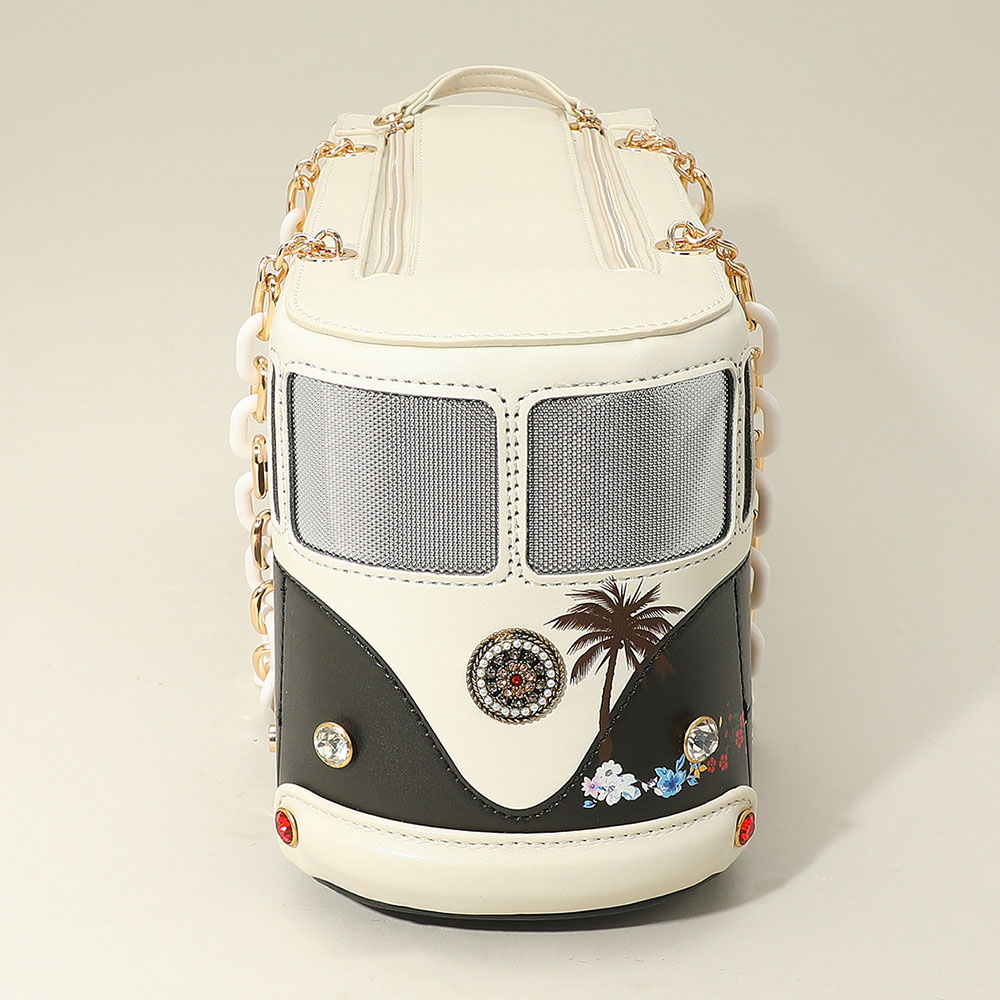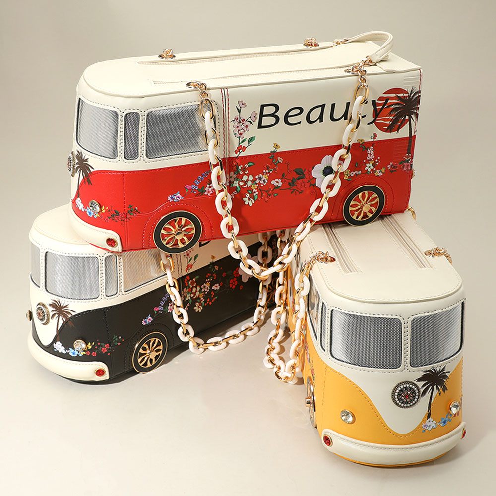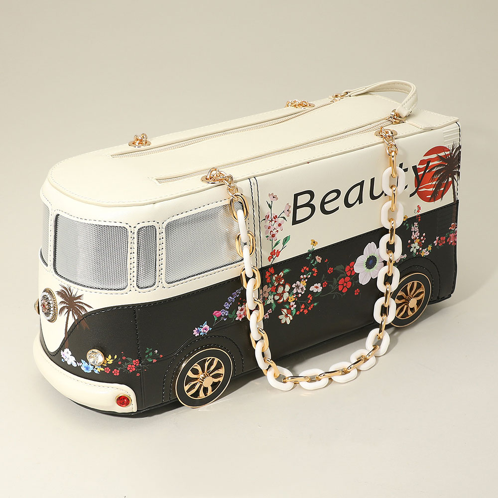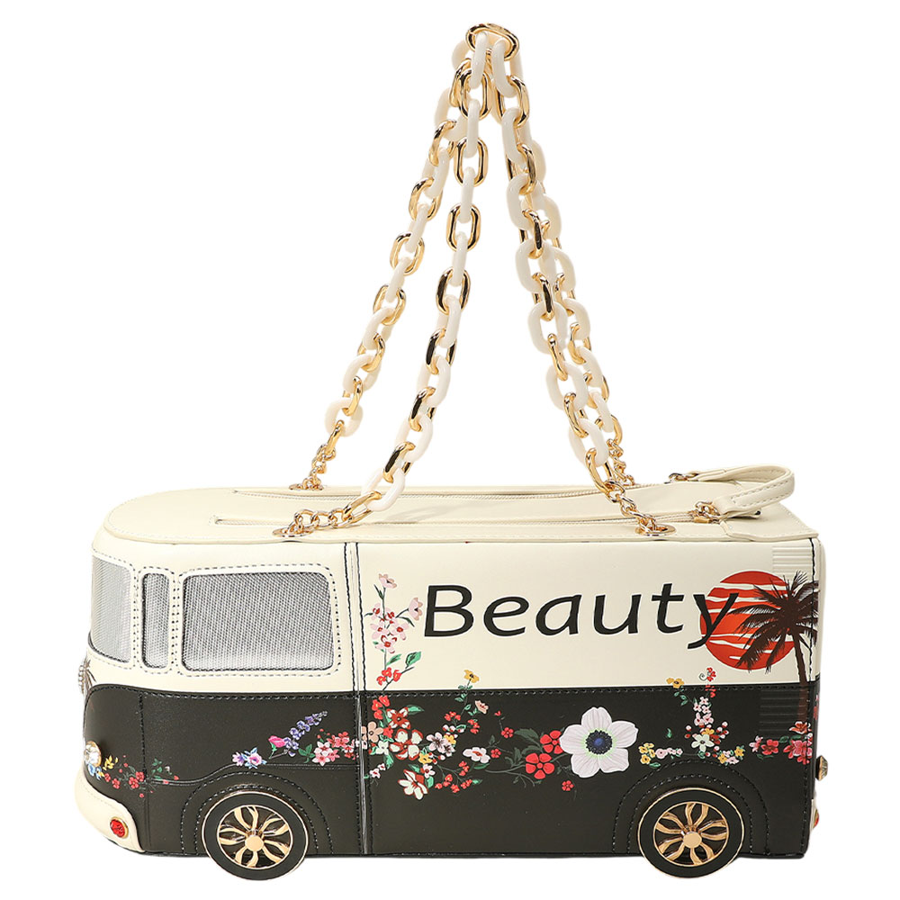 Details • Size : 13.5" X 6" X 5" • Top Handle Chain Size : 8.25" L • Velcro Strip / Zipper Closure • One Inside Zipper Pocket • Two Inside Slip Pockets • Playful bus-shaped handbag with floral prints and the word "Beauty" on the side. Features a sturdy chain strap, zip closure, and creative design perfect for fashion lovers who enjoy unique, standout accessories.