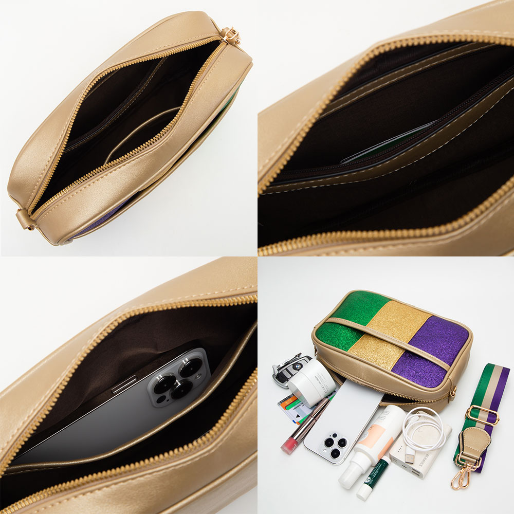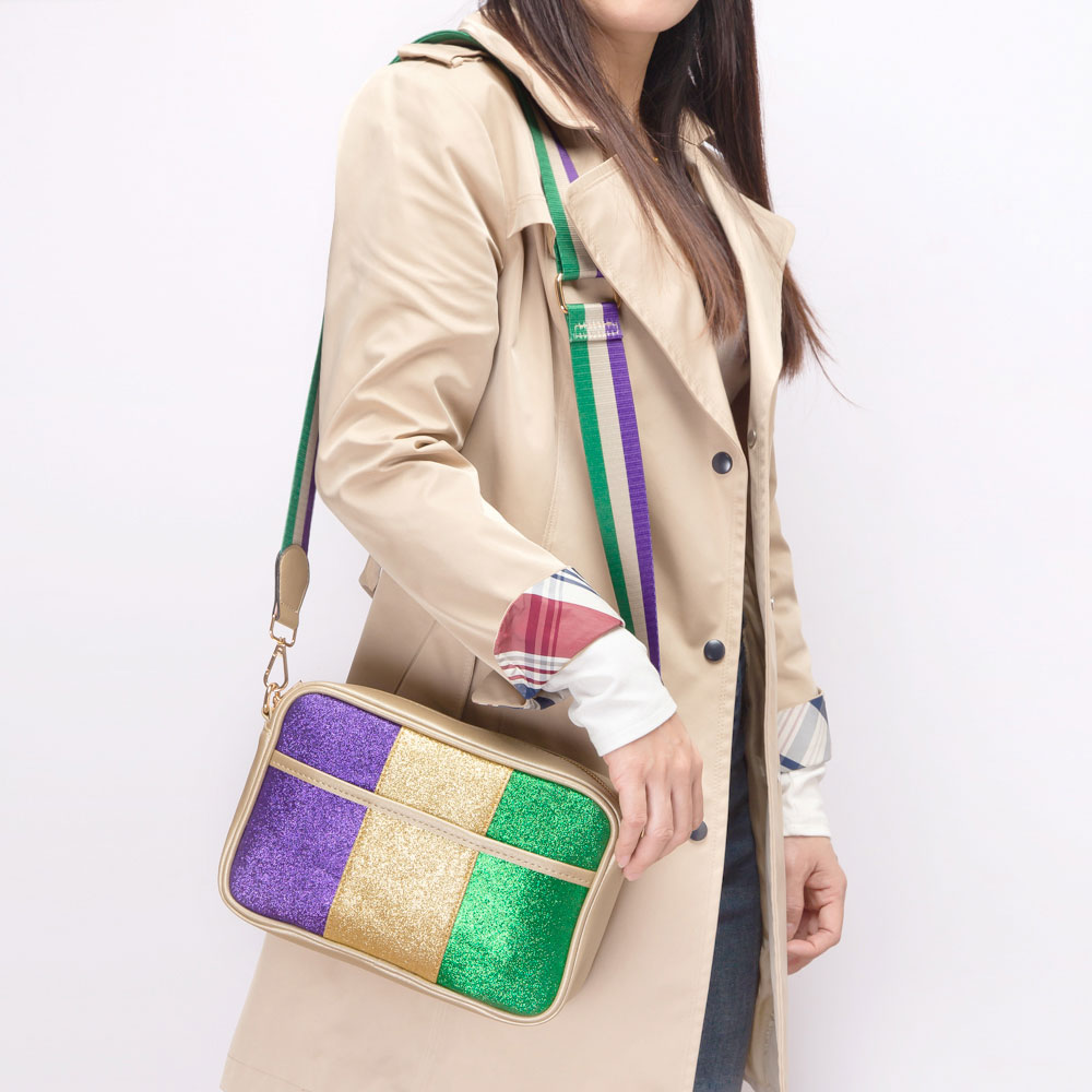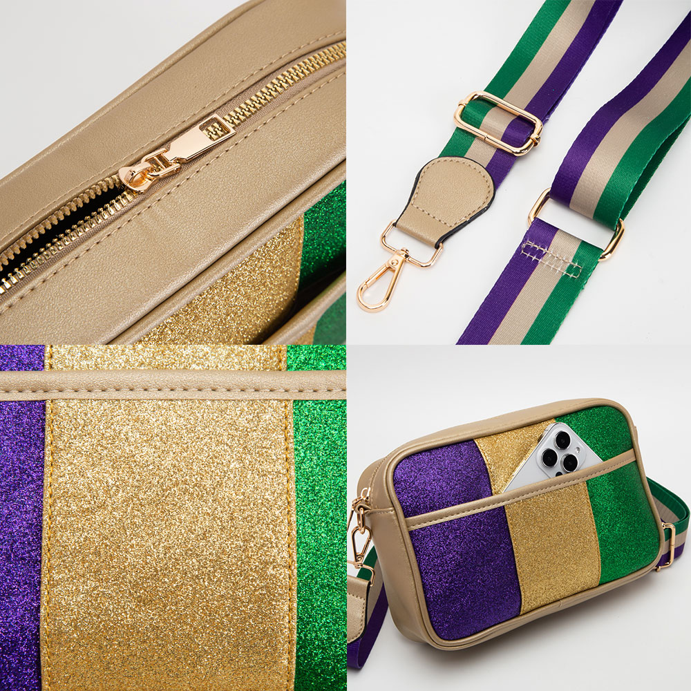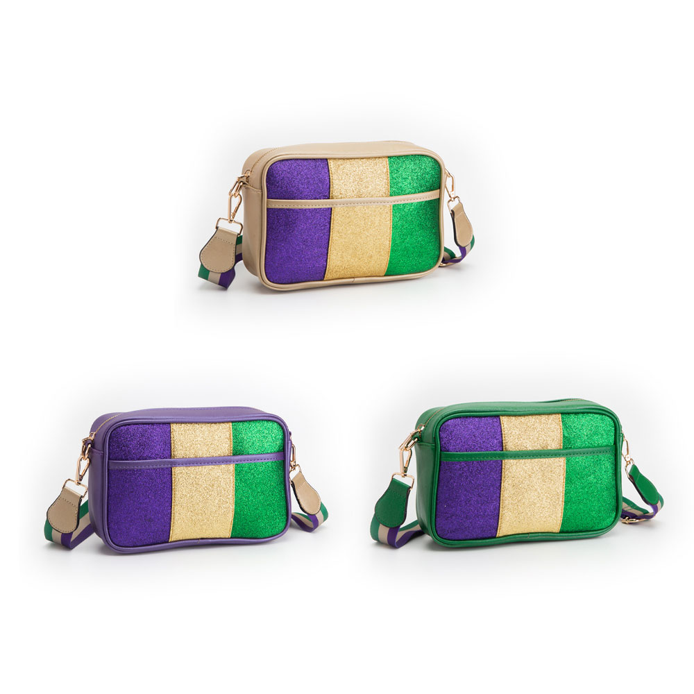 Details • Size : 9.8" X 6.7" X 2.75" • Strap Size : Adjustable / Detachable • One Outside Slip Pocket • One Inside Slip Pocket • One Inside Zipper Pocket • Zipper Closure • Glitter crossbody bag with festive Mardi Gras colors and a detachable strap. Roomy, lightweight, and parade-ready—perfect for hands-free celebration.