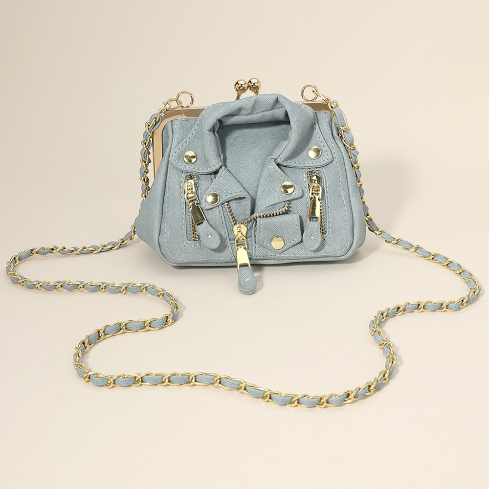 Details • Size : 6" X 5.25" X 3.2" • Strap Size :46" L • Clasp Closure • Elevate your style with this mini motorcycle jacket frame handbag featuring edgy zipper details, a structured design, and a chic chain strap. Compact yet versatile, it’s the perfect accessory to complement both casual outings and elegant evening looks.
