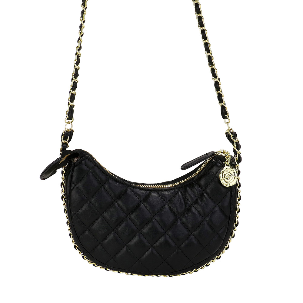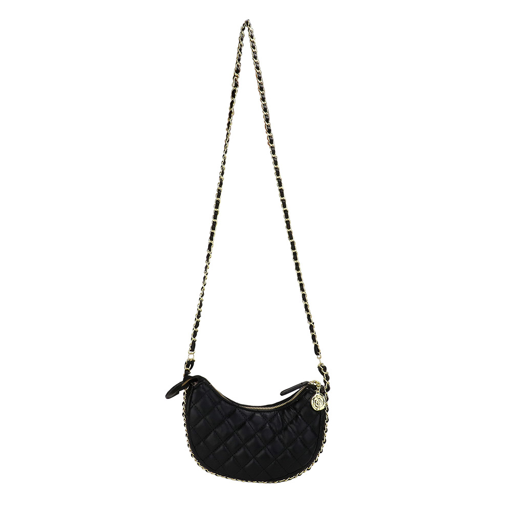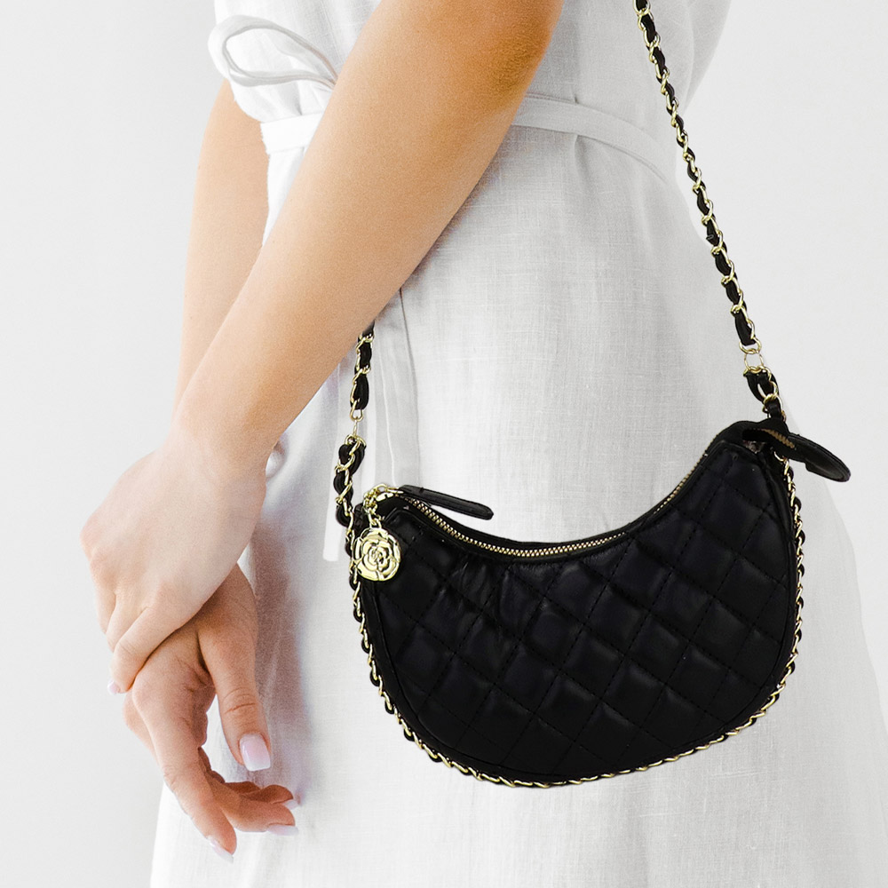 • Chic half-moon shoulder bag with woven texture and chain strap. A modern accessory for a sleek everyday look, combining elegance and practicality for day-to-night style.