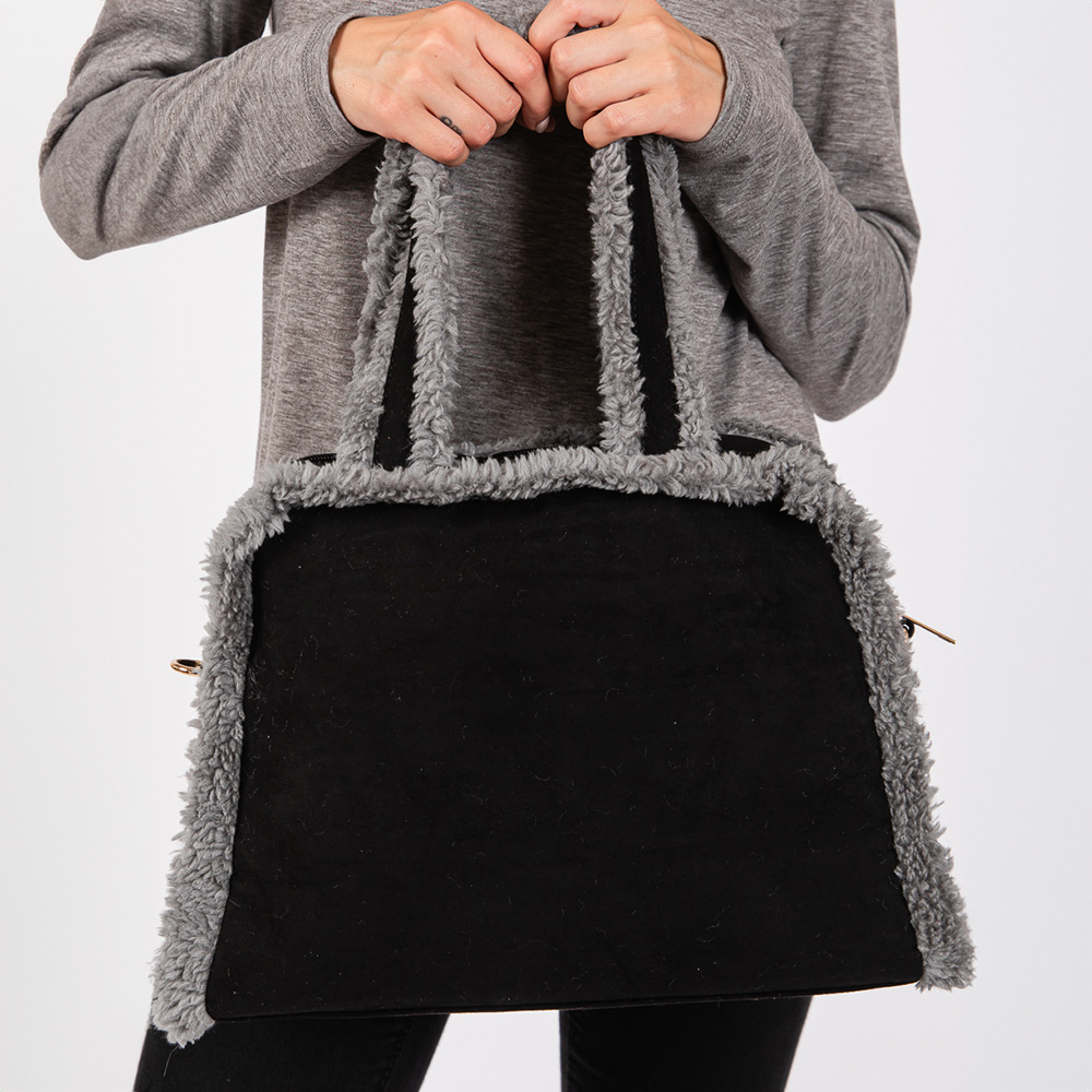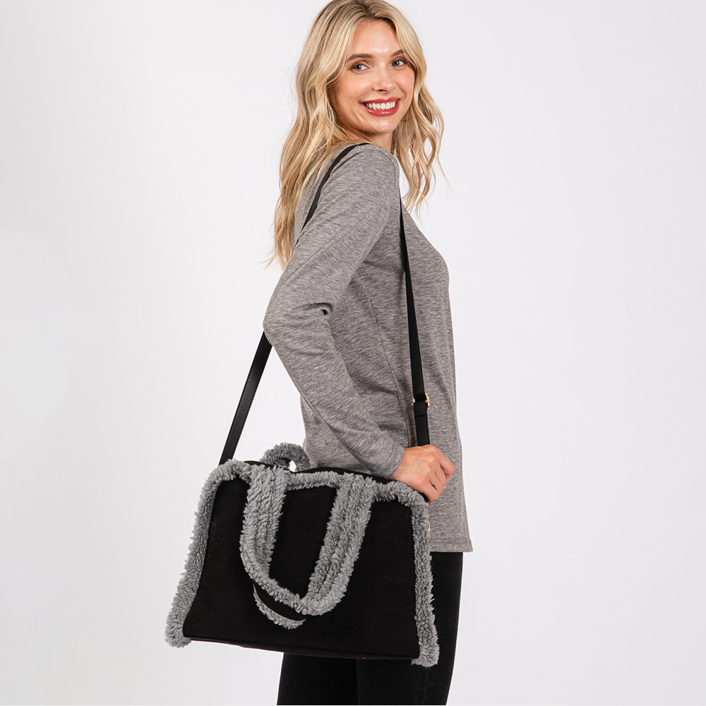 Fleece Trimmed Solid Tote / Crossbody Bag With Adjustable Strap