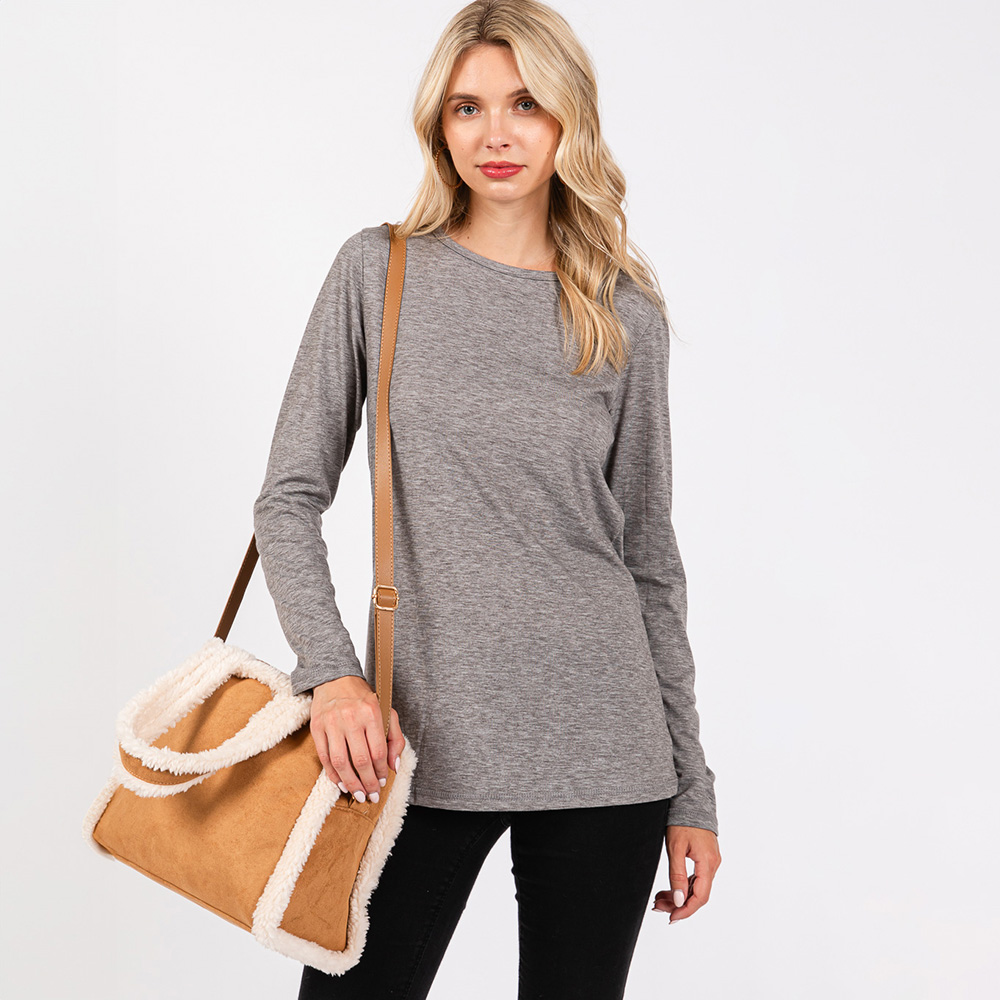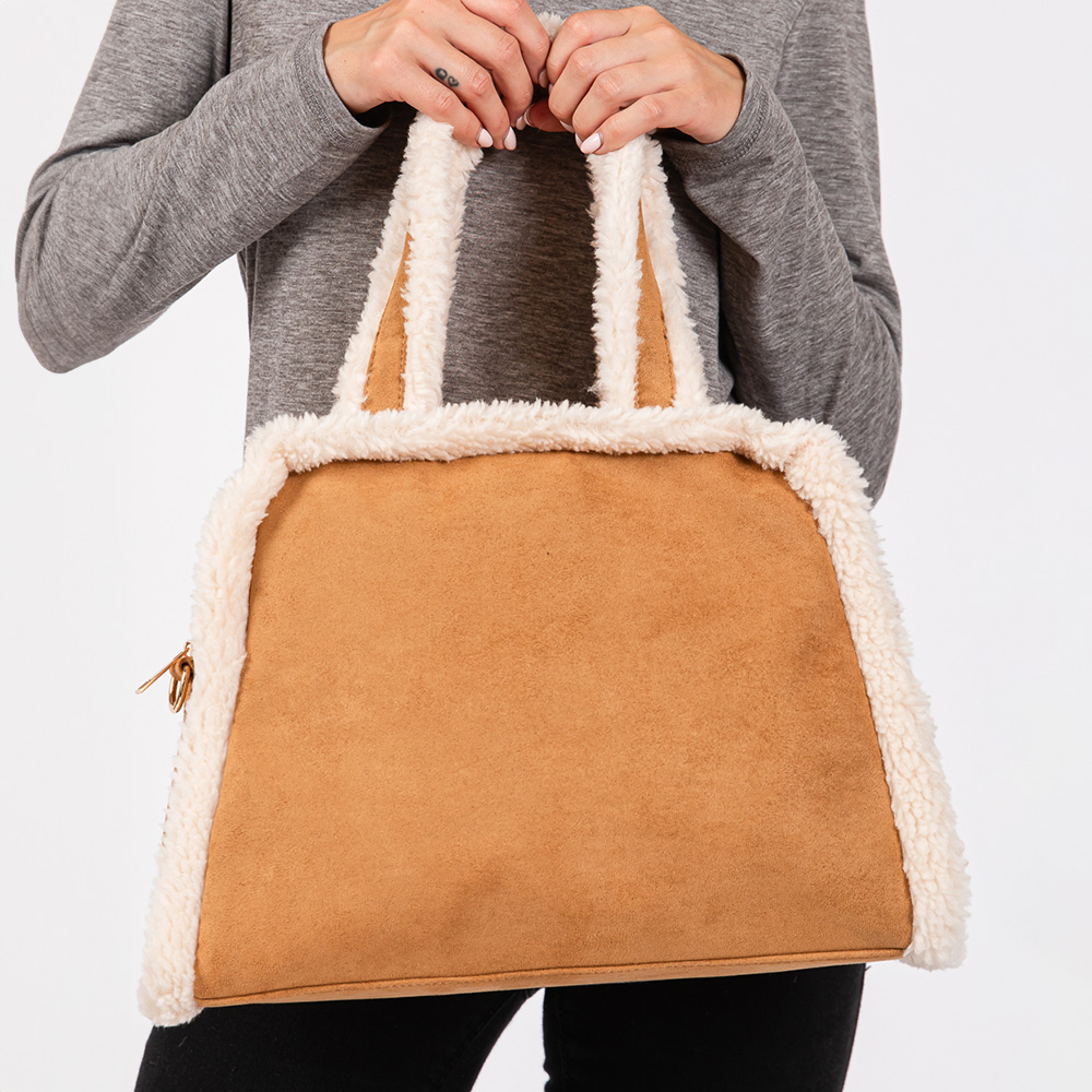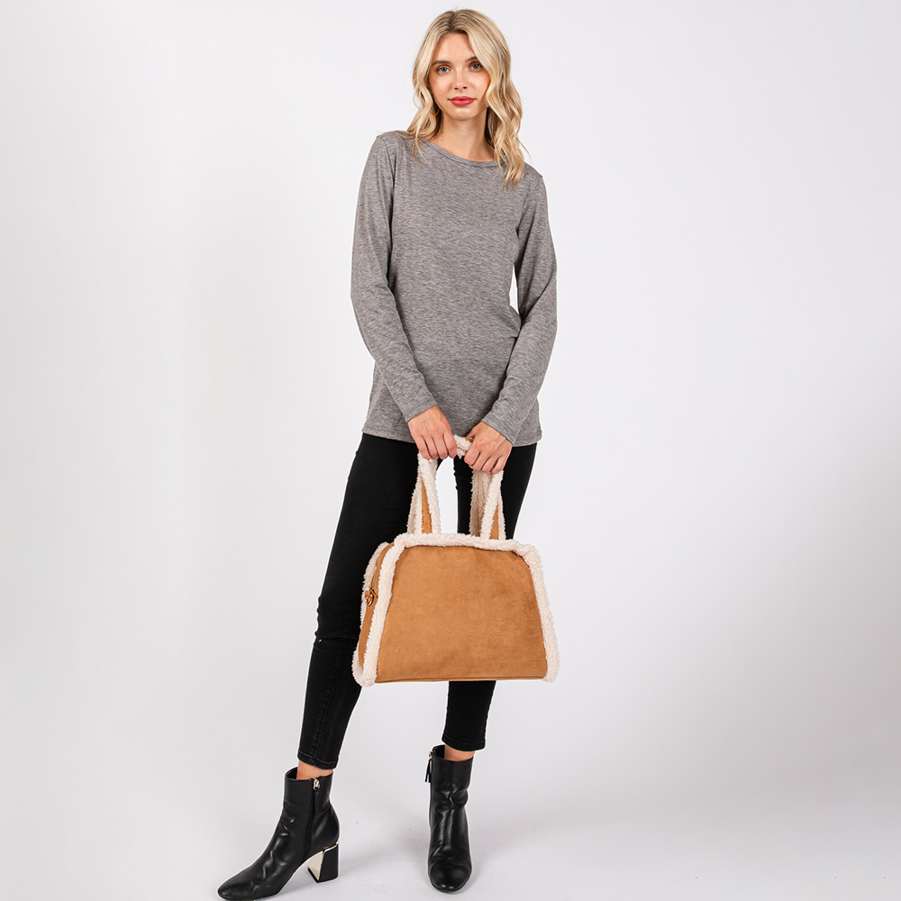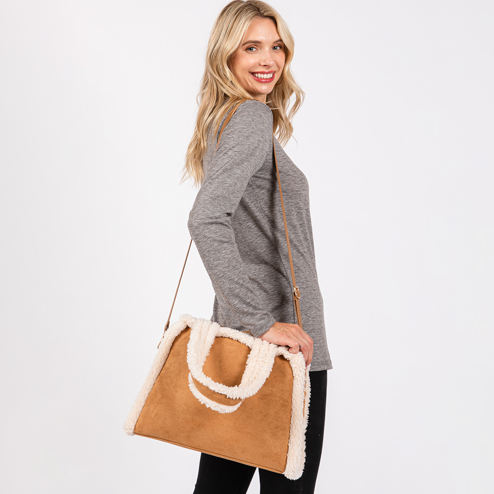 Fleece Trimmed Solid Tote / Crossbody Bag With Adjustable Strap