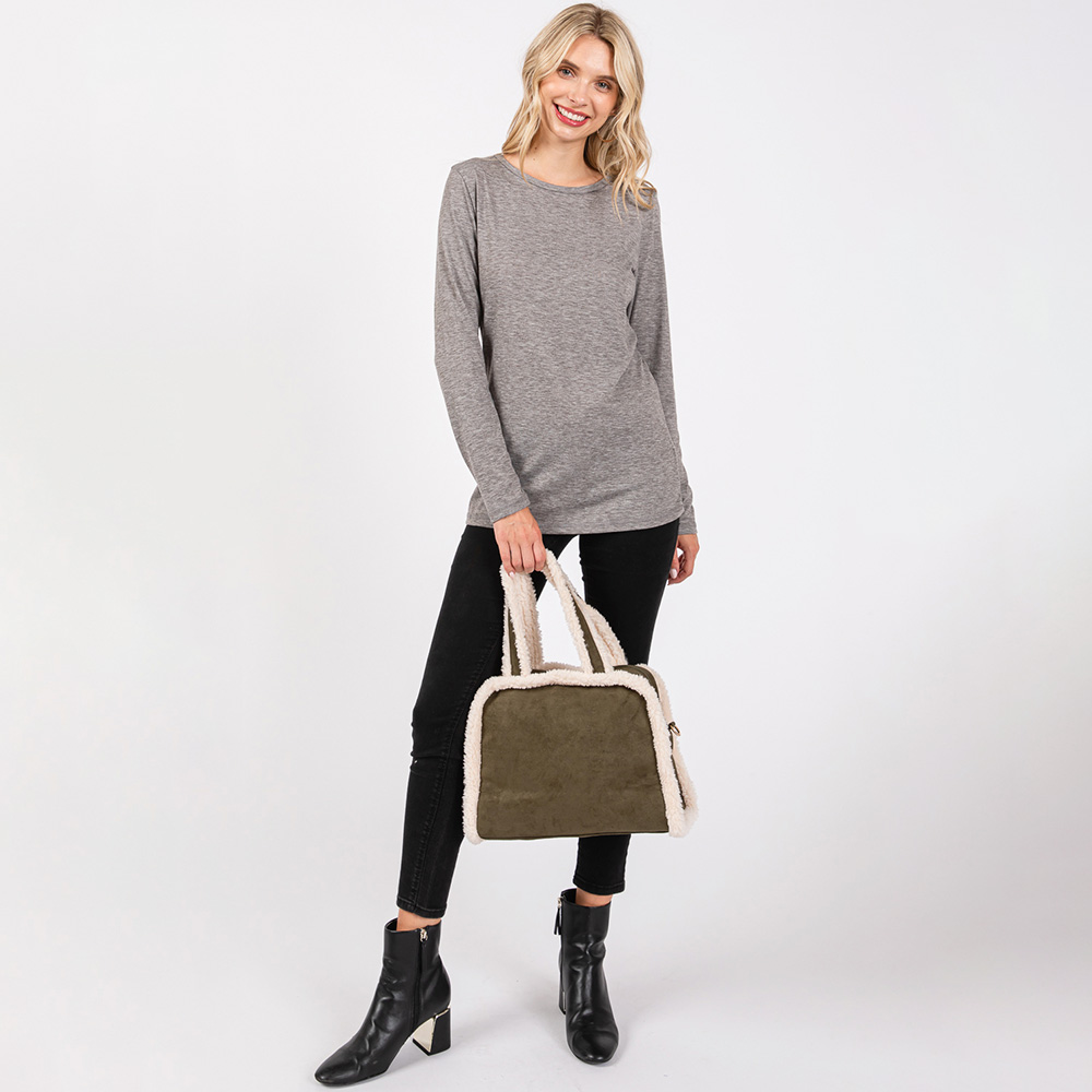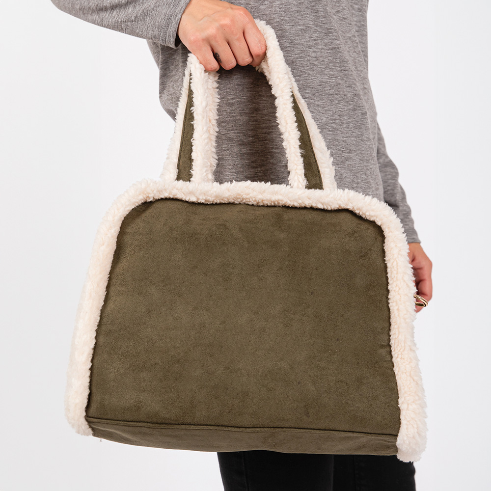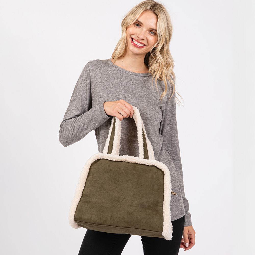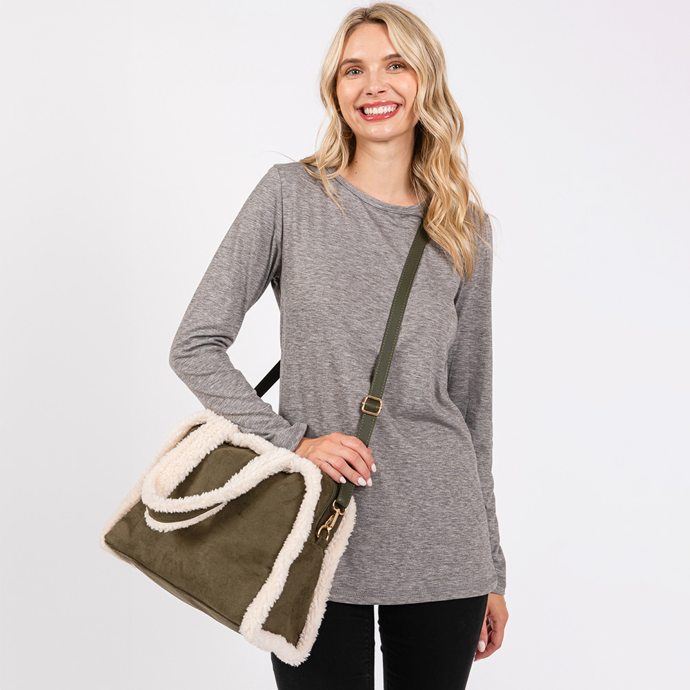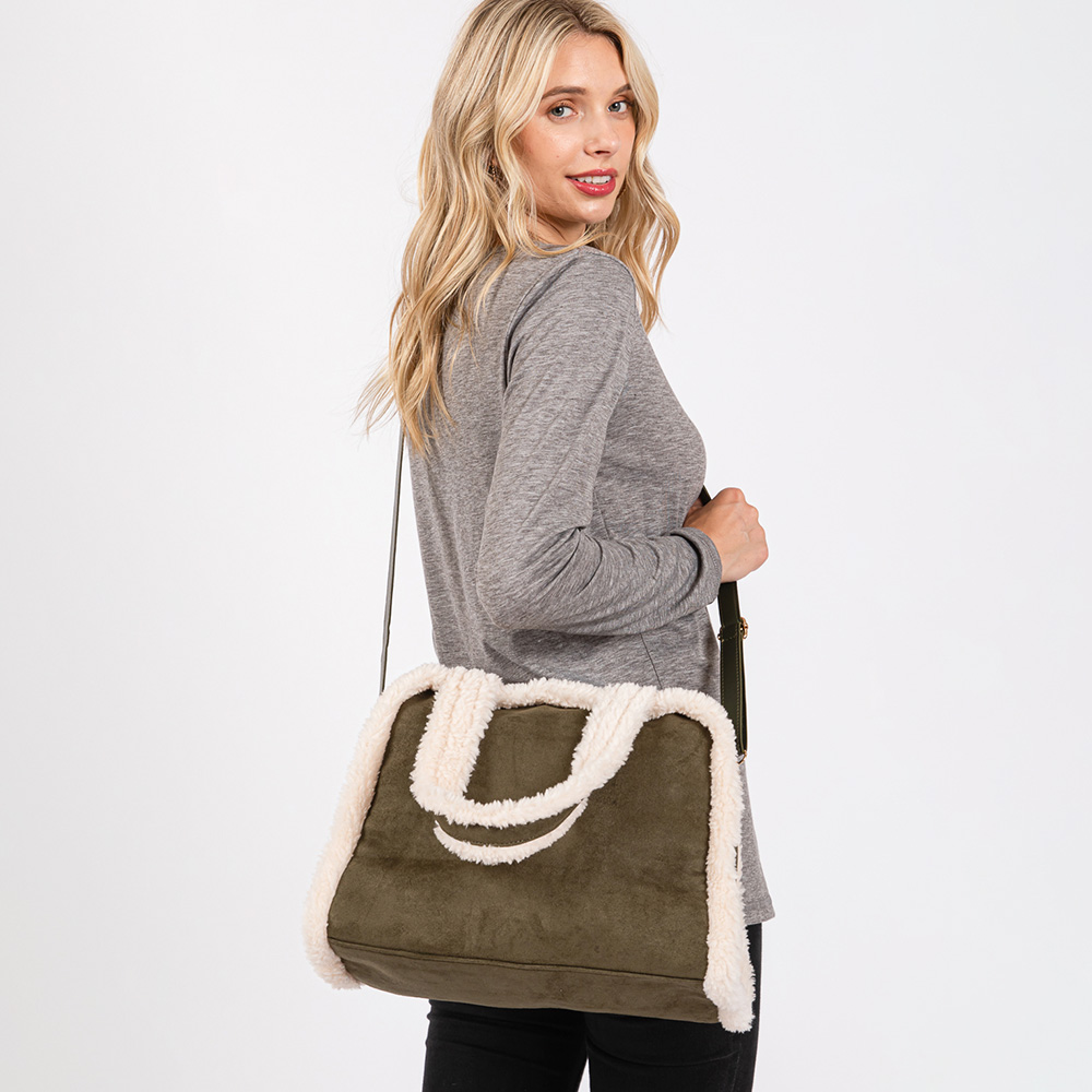 Fleece Trimmed Solid Tote / Crossbody Bag With Adjustable Strap