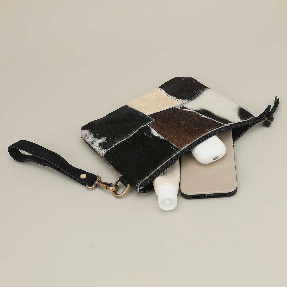 Genuine Leather Cowhide Calf Fur Patchwork Wristlet Pouch Clutch Bag