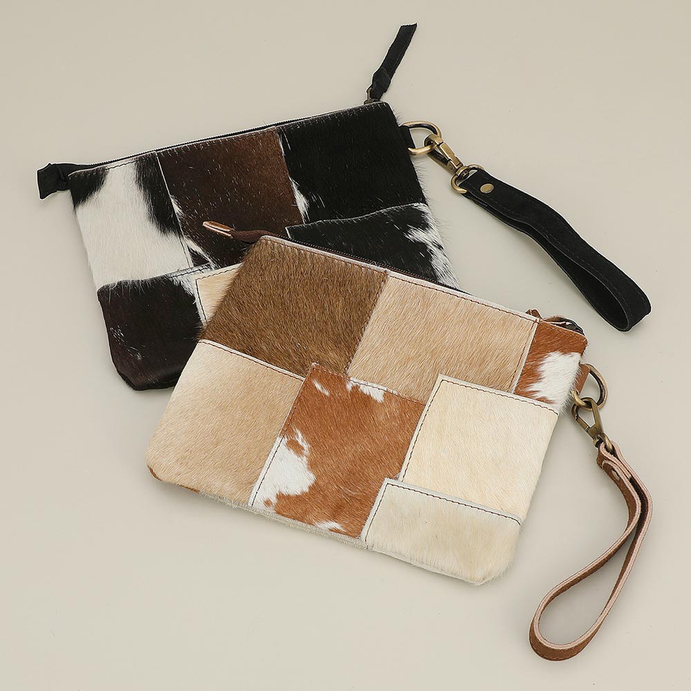 Genuine Leather Cowhide Calf Fur Patchwork Wristlet Pouch Clutch Bag