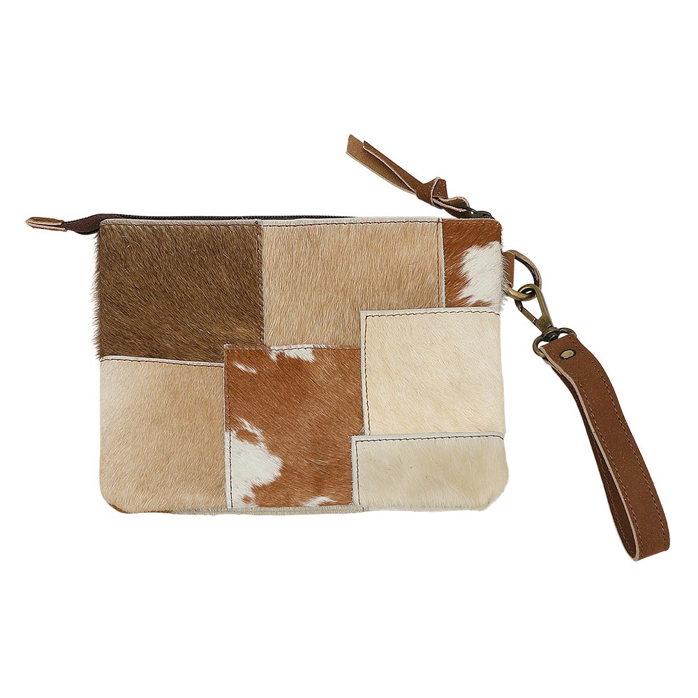 Details • Size : 8.75" X 7" • Wristlet Size : 8" L • Zipper Closure • Stylish cowhide wristlet pouch clutch with patchwork front, secure zip closure, and detachable strap. Compact yet spacious enough for phone, keys, and daily essentials. Perfect for travel, errands, or organizing items inside larger bags with a chic, functional touch. • Colors May Vary • Made In India