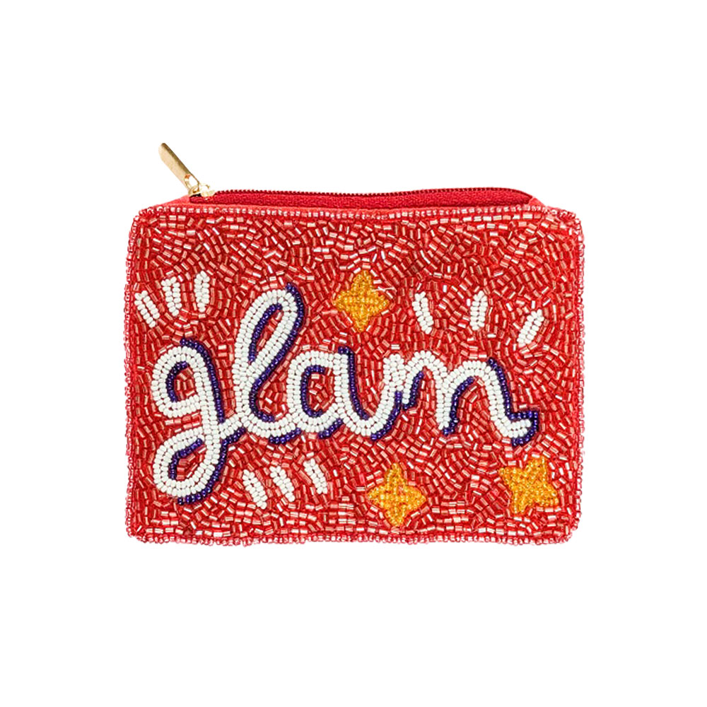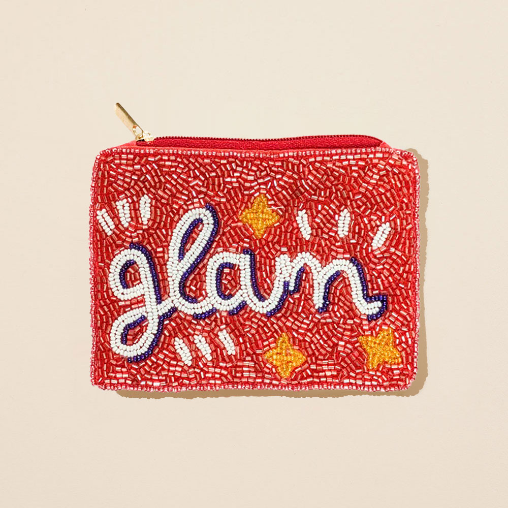 Details • Size : 5" X 3.75" • No Inside Pocket • Beads On Front Only • Zipper Closure • Add sparkle to your style with this eye-catching beaded pouch featuring the word "glam" surrounded by playful star accents. Perfect for holding small essentials, this compact bag combines function and flair, making it a fun gift or standout piece for any glam lover. • Made In India