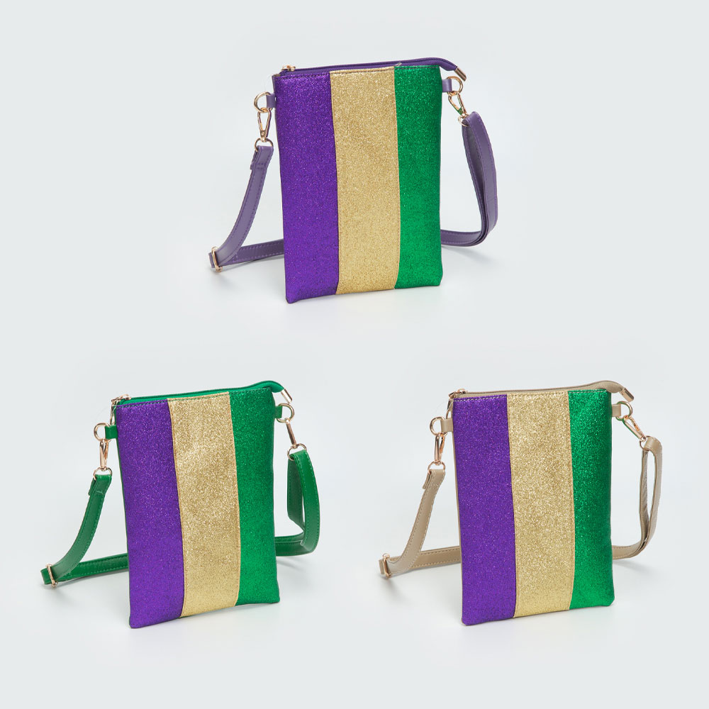Glittered Vertical Strip Mardi Gras Flat Mini Crossbody Bag