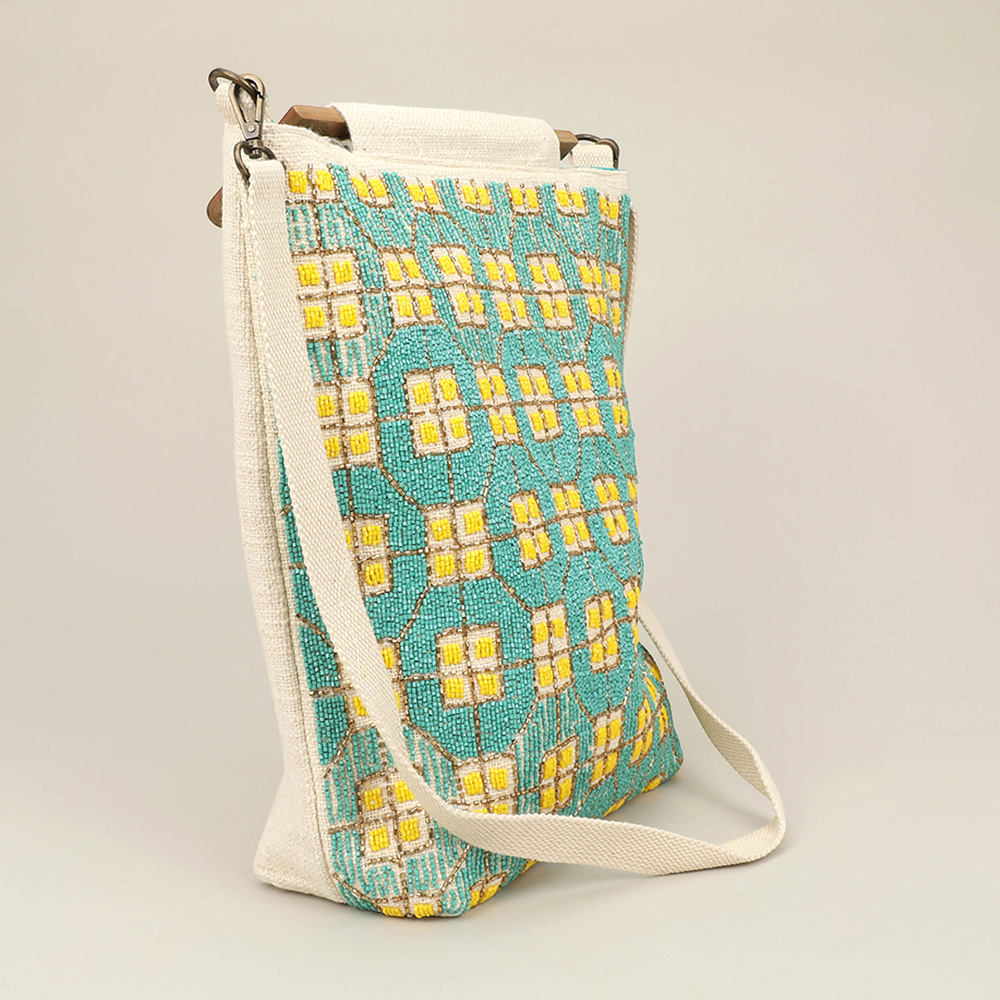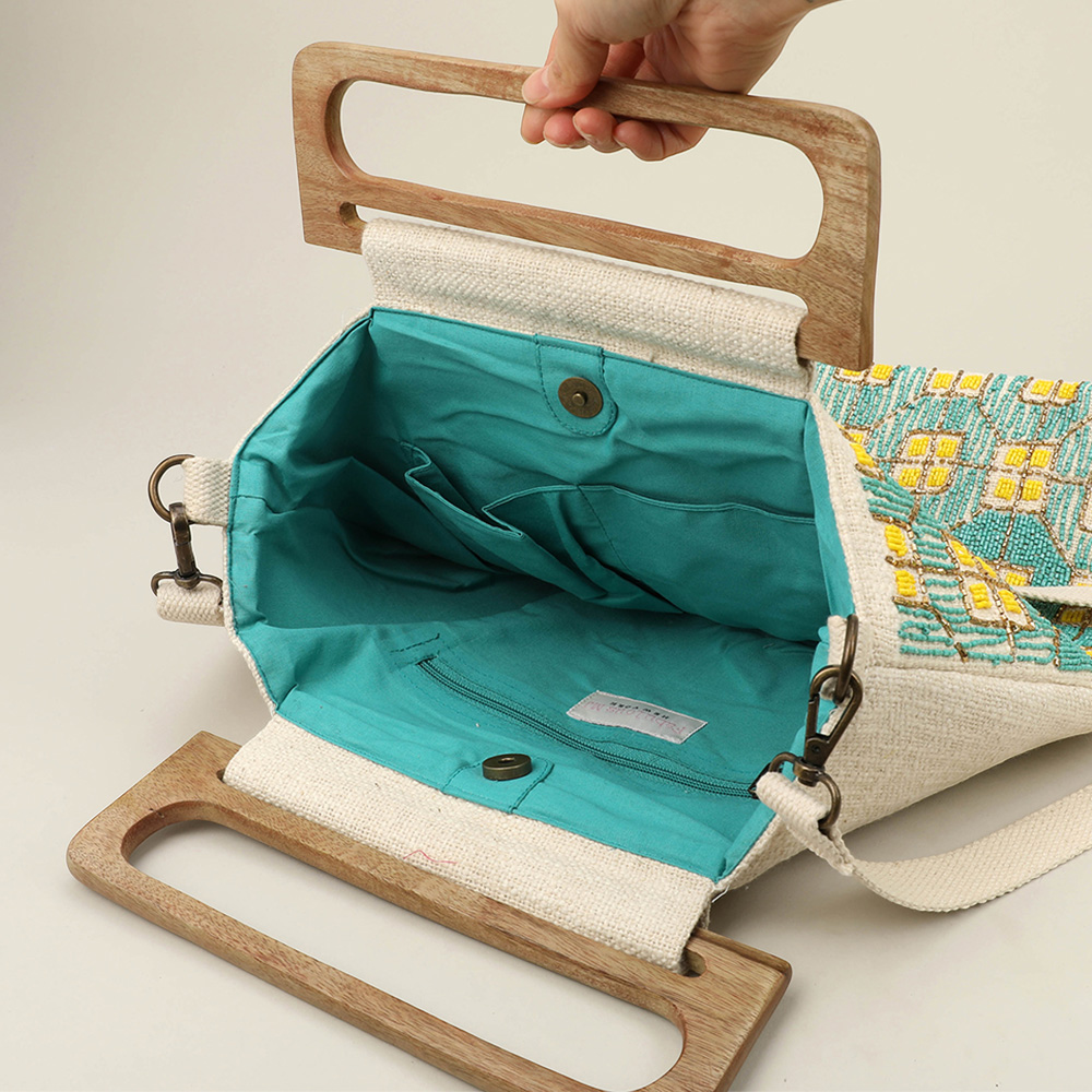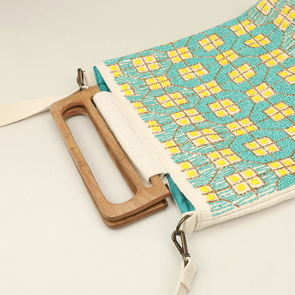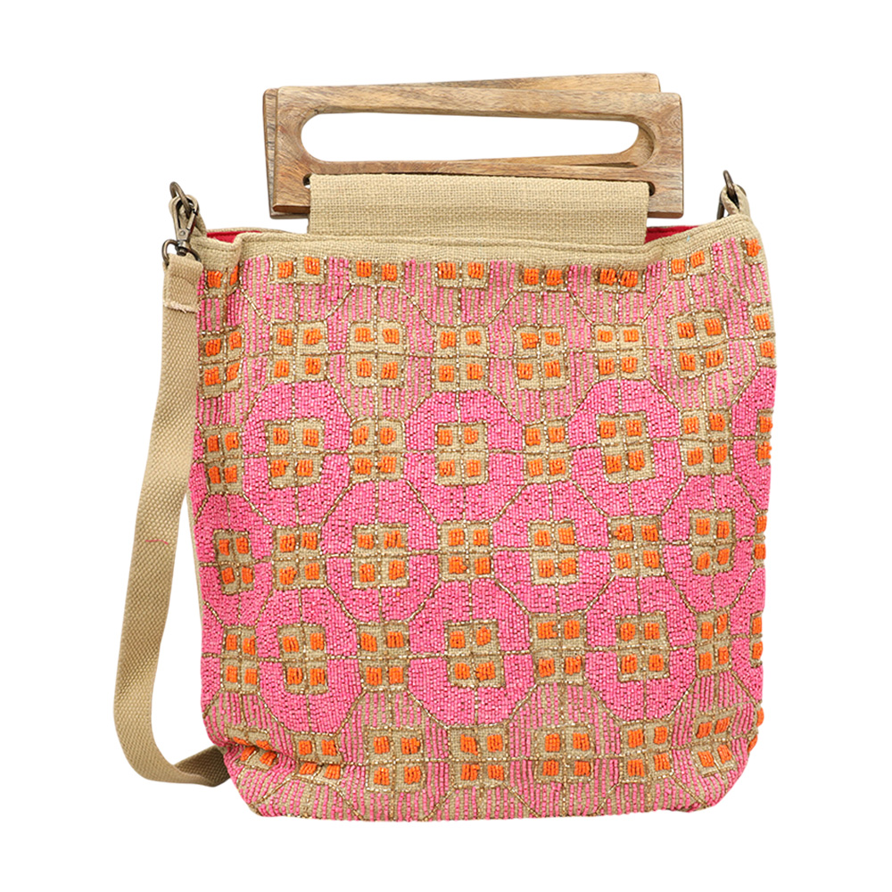 Handcrafted Beaded Boho Wooden Handle Tote / Crossbody Bag